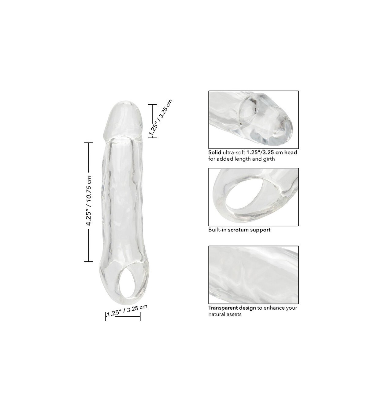 Experimenta un placer elevado con la Performance Maxx Clear Extension 5.5". Esta extensión aumenta tu tamaño y confianza, ofreciendo longitud y grosor adicionales. Con una cabeza sólida ultra suave de 1.25 pulgadas / 3.25 cm, proporciona una sensación realista, y el diseño transparente estimula visualmente, mostrando tus atributos naturales. El diseño hueco realista es cómodo, con una correa de escroto incorporada para estabilidad durante el uso. Fabricado con materiales seguros para el cuerpo, sin fragancias y libres de ftalatos, garantiza tranquilidad. Ya sea agregando emoción a encuentros íntimos o explorando nuevas sensaciones, la Performance Maxx Clear Extension 5.5" mejora las experiencias y ayuda a alcanzar nuevos niveles de placer.