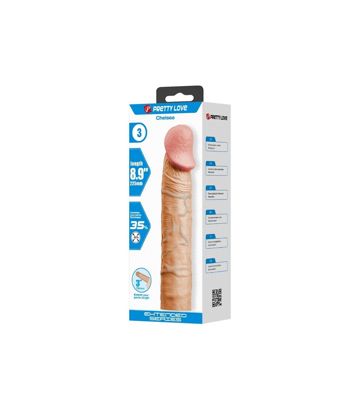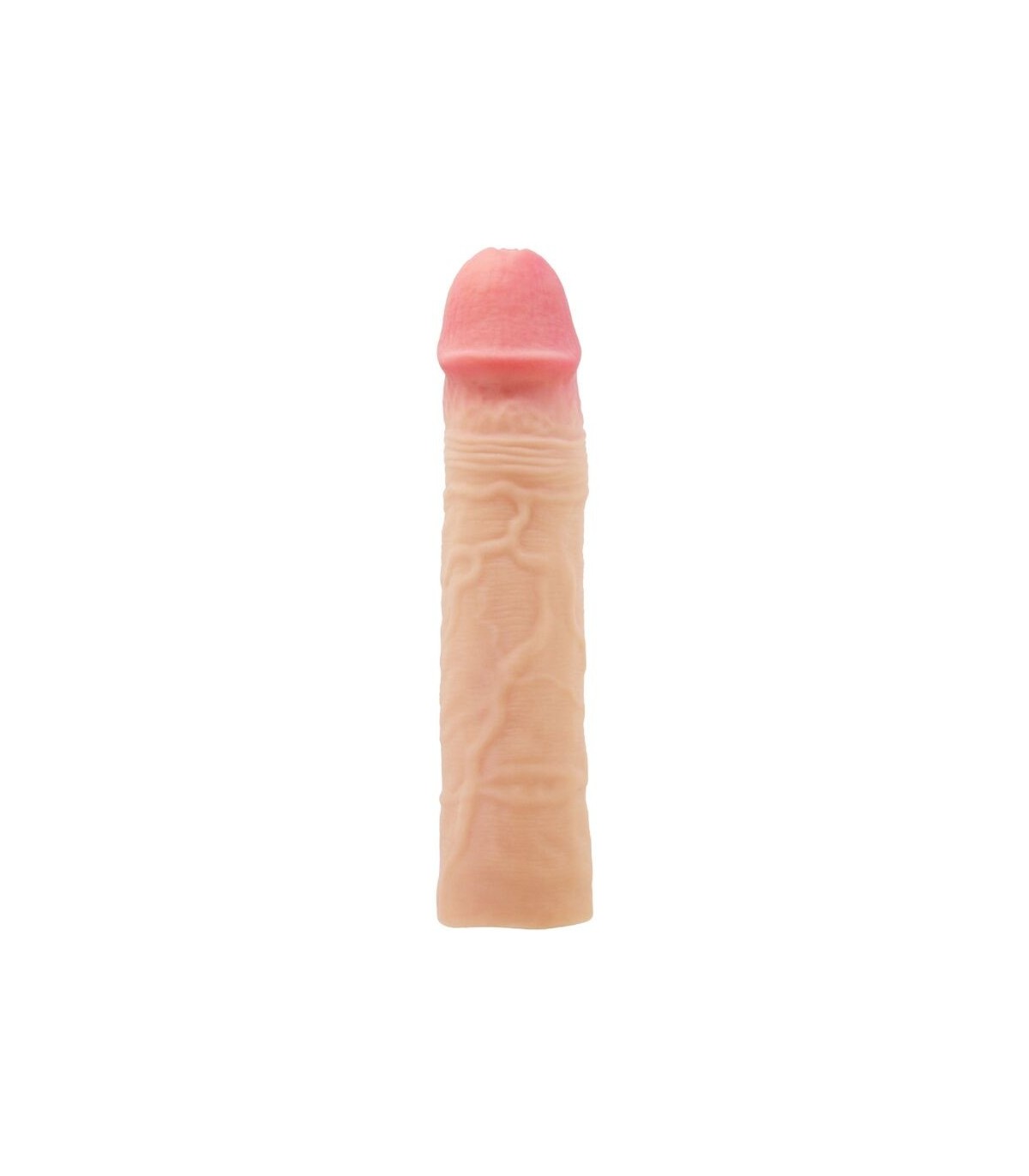 Aumente el tamaño de su pene con esta funda para el pene de placer. Fabricada con material ultra realista para un placer realista. La superficie externa está texturizada con venas realistas y presenta una cabeza bulbosa para garantizar que su amante experimente sensaciones naturales. Un canal interno suave abraza su erección para un máximo contacto y estimulación.