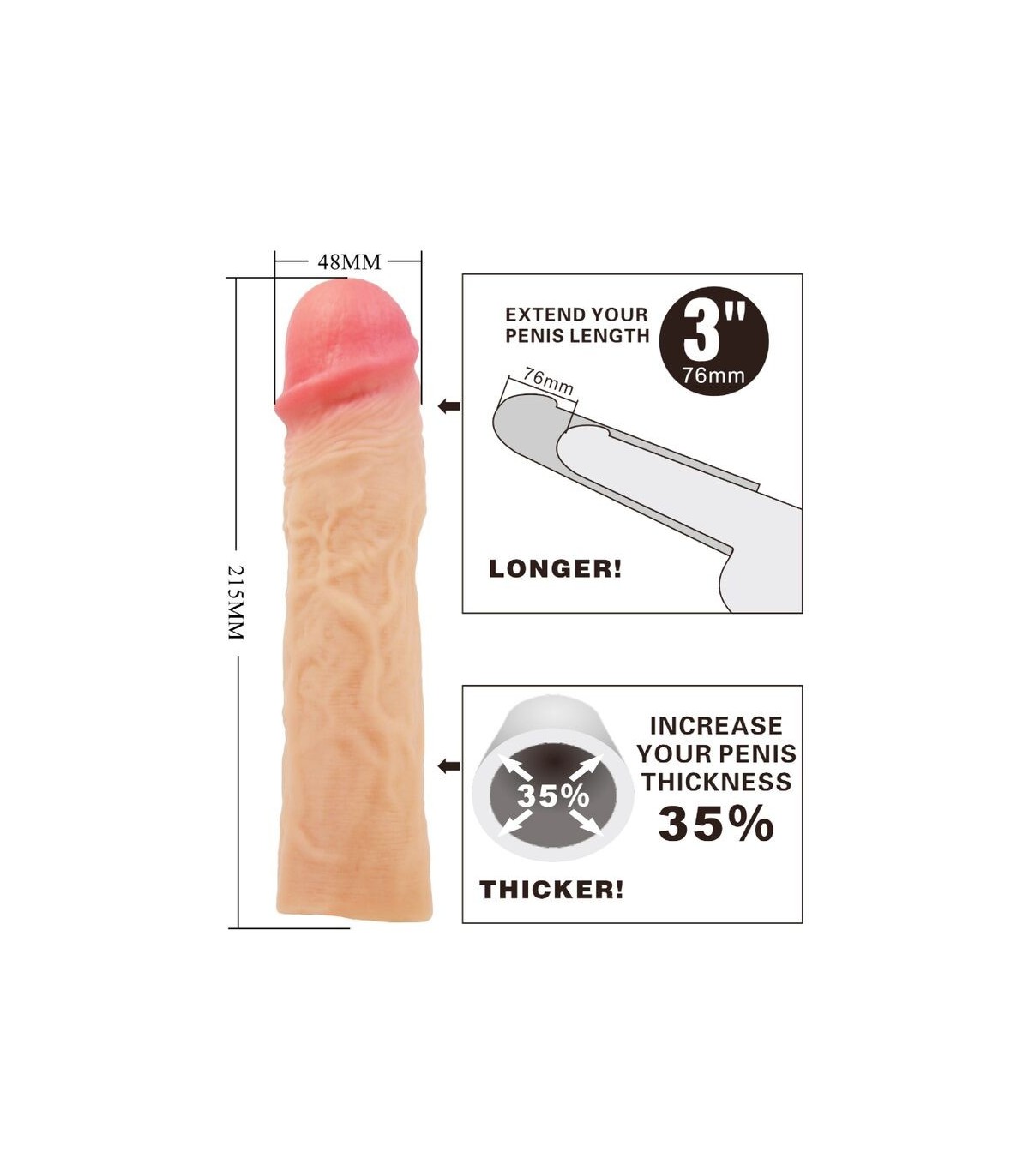 Aumente el tamaño de su pene con esta funda para el pene de placer. Fabricada con material ultra realista para un placer realista. La superficie externa está texturizada con venas realistas y presenta una cabeza bulbosa para garantizar que su amante experimente sensaciones naturales. Un canal interno suave abraza su erección para un máximo contacto y estimulación.