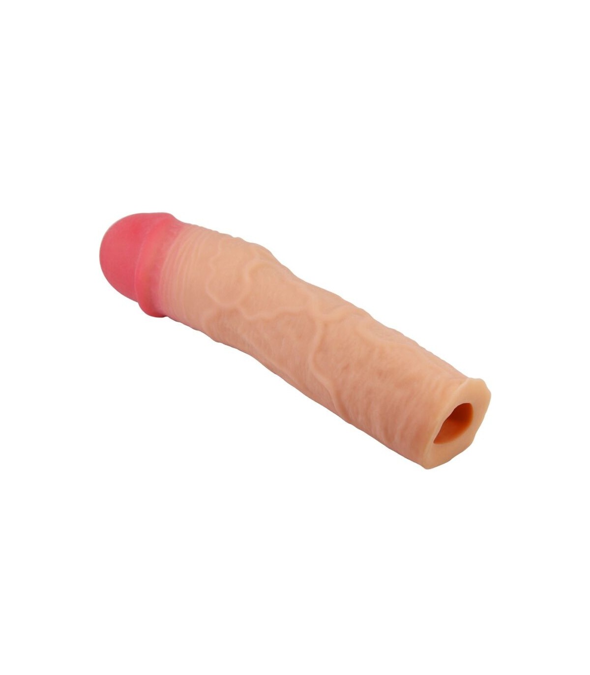 Aumente el tamaño de su pene con esta funda para el pene de placer. Fabricada con material ultra realista para un placer realista. La superficie externa está texturizada con venas realistas y presenta una cabeza bulbosa para garantizar que su amante experimente sensaciones naturales. Un canal interno suave abraza su erección para un máximo contacto y estimulación.