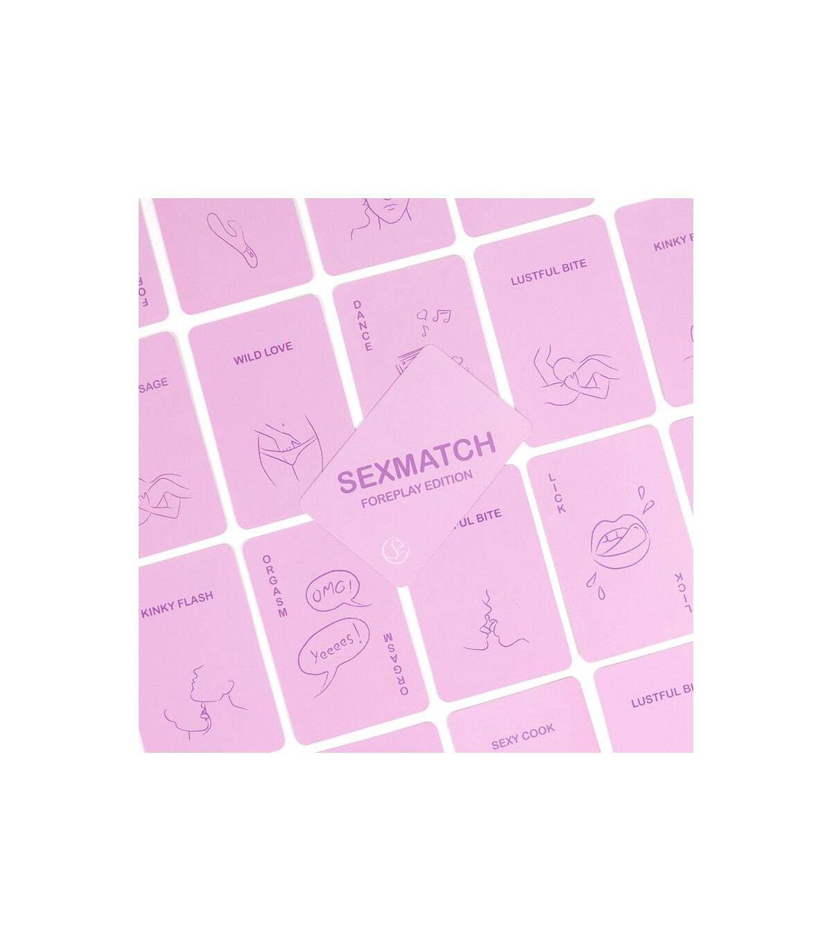 Sexmatch Foreplay Edition es el juego de cartas para parejas en el que debes hacer coincidir ilustraciones y palabras realizando desafíos hasta que uno de los dos se quede sin cartas. El juego contiene 89 cartas de juego (81 cartas y 8 comodines) y 1 carta guía.