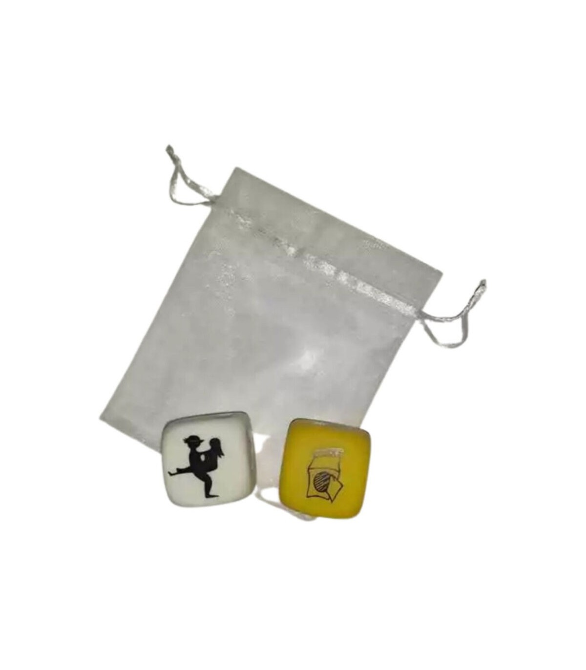 JUEGO DE DOS DADOS DE COLOR BLANCO DE GRAN CALIDAD DE 30 mm que van en una bolsita de seda trasparente. Estos dados te dirán la postura que debes hacer y en qué lugar. TIRA LOS DADOS. HAY 36 COMBINACIONES POSIBLES.