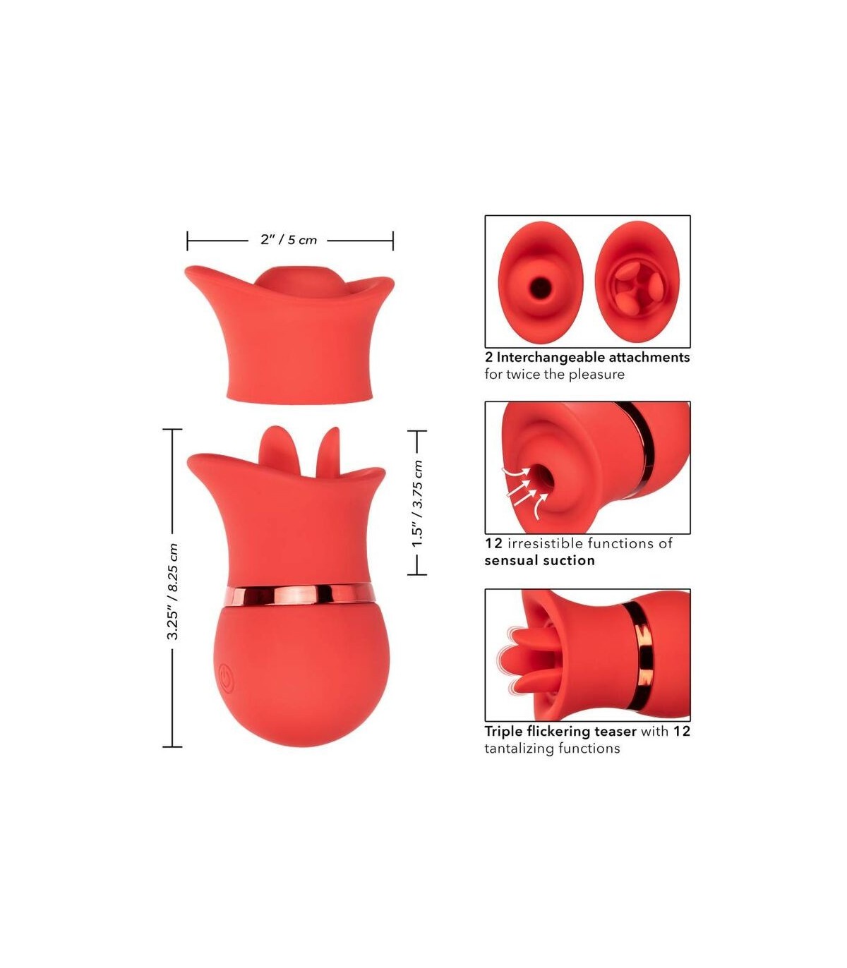 Dos veces el placer, oh la la! El sensual conjunto intercambiable de chupas de besos franceses es justo lo que necesita con 2 accesorios intercambiables con 12 funciones de vibración o 12 funciones de succión. La primicia de contacto completa y el teaser de triple lengua aleteo han sido diseñados para contornear perfectamente a sus puntos de placer más íntimos con 12 funciones intensas. Cambie en el encasador sensualmente contorneado y disfrute de 12 funciones de succión emocionante o disfrute de un verdadero beso francés con 12 funciones de acción parpadeante. La silicona suave y flexible y el cuerpo sensualmente contorneado le permiten entregar un placer identificado desde casi cualquier ángulo. Use el botón de fácil toque para controlar hasta 50 minutos de placer. Recargue su placer en solo 1 hora con el cable USB proporcionado en el puerto de carga de autoselección en el masajeador. El tamaño discreto y el botón de bloqueo de viaje del mini masajeador lo convierten en el compañero de viaje perfecto, lo que le permite abrazar el placer radiante donde las fantasías lo lleven .