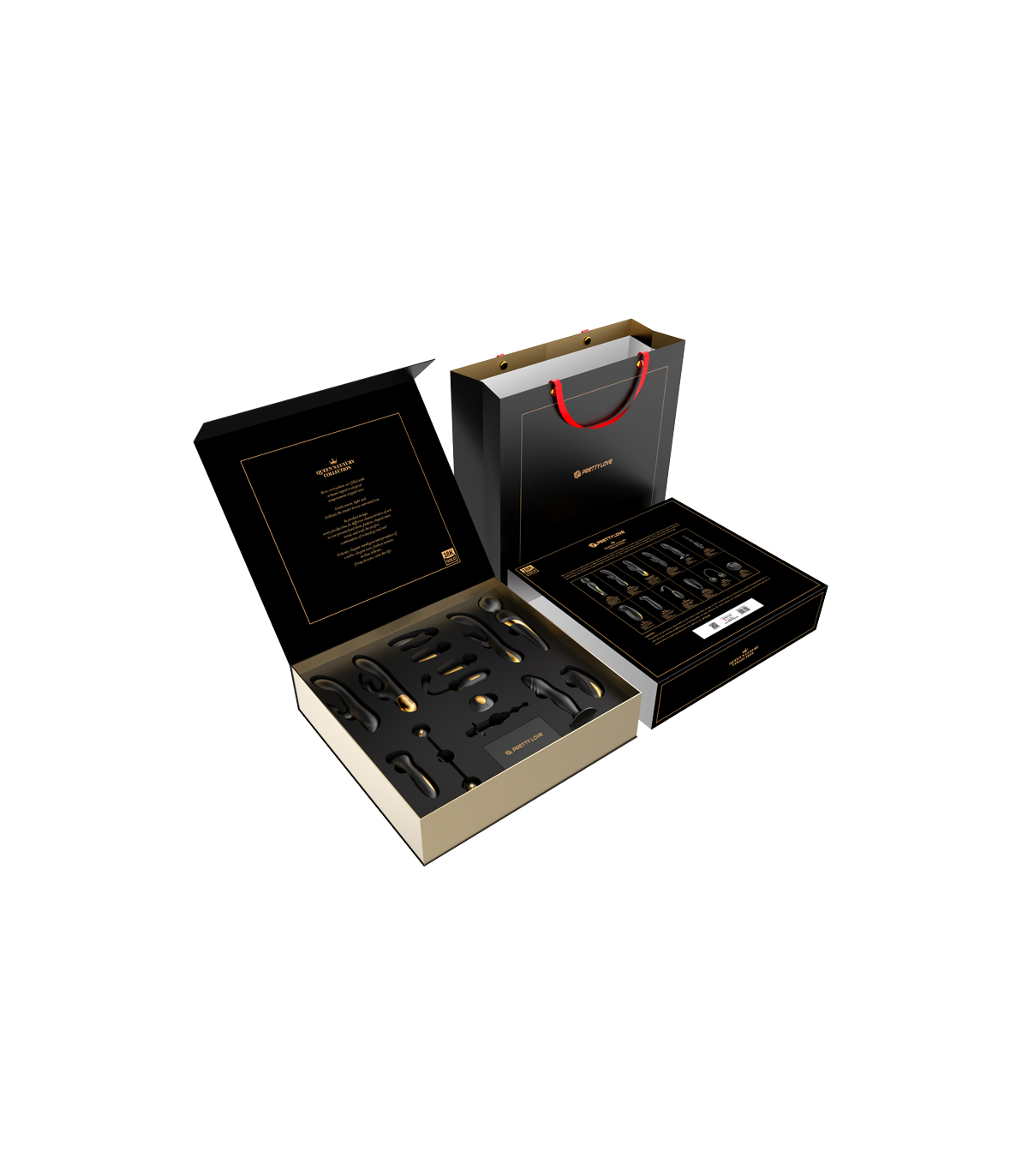 Kit de Lujo Negro & Oro que incluye 12 juguetes con vibración, lamido, succión, control remoto inalámbrico y juguetes de electroestimulación. Muchos están adornados con adornos de oro de 18k o 24k. Todos los juguetes son de silicona y los juguetes vibradores son recargables por USB.