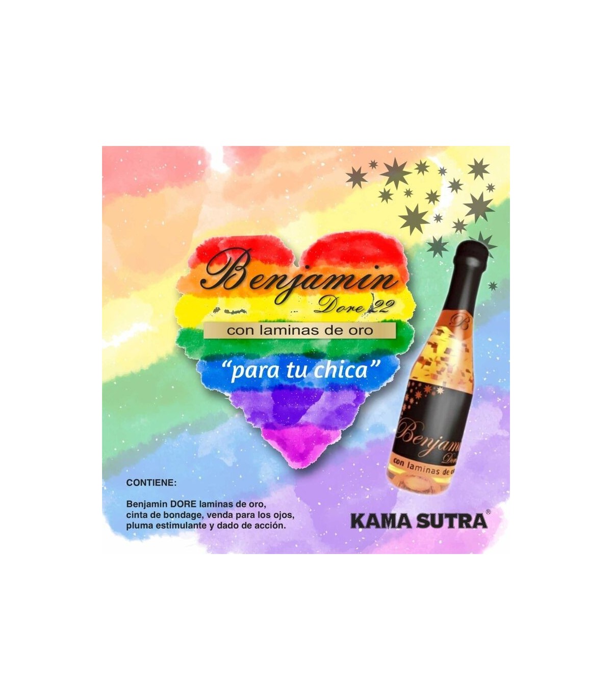 ESTUCHE con un BENJAMIN DORE CON LAMINAS DE ORO DE 22 KILATES de carácter afrutado, fresco y joven, compuesto por un vino espumoso muy selecto CON LAMINAS DE ORO de 22 KILATES PARA TU CHICA CON BANDERA ARCOIRIS, ORGULLO LGTB.