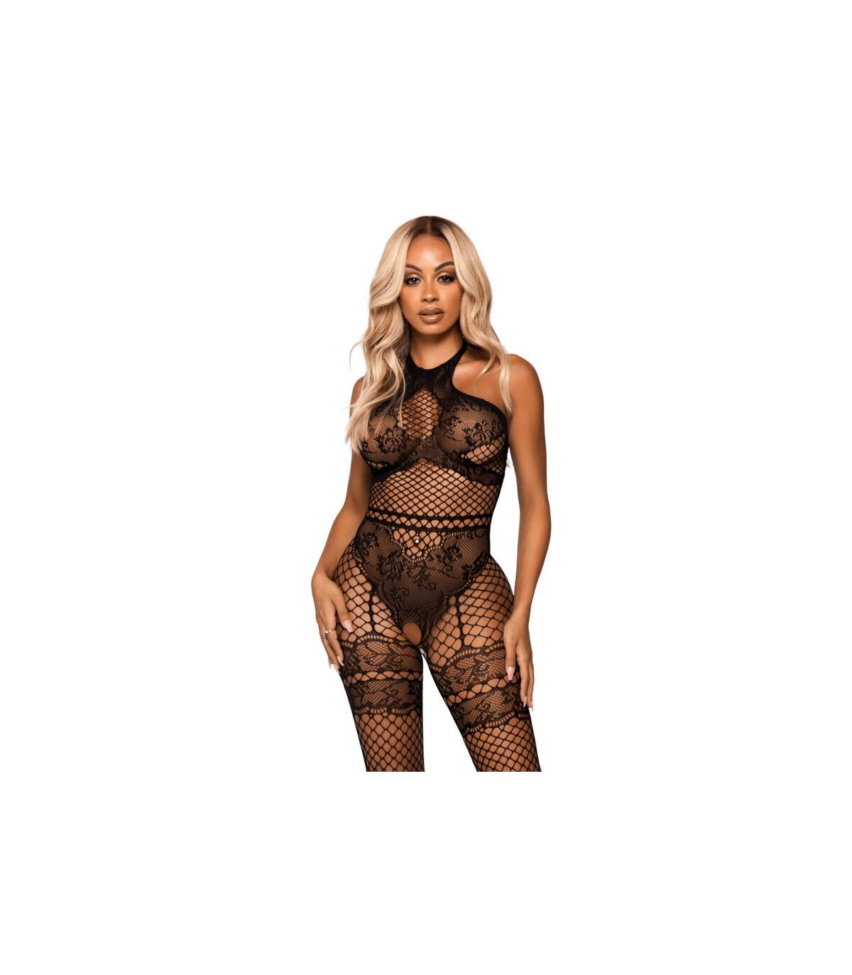 Bodystocking sin costuras en red industrial y encaje de imitación con cuello halter. Con Leg Avenue reforzarás tu feminidad y obtendrás ese toque justo de seducción, sensualidad y elegancia.