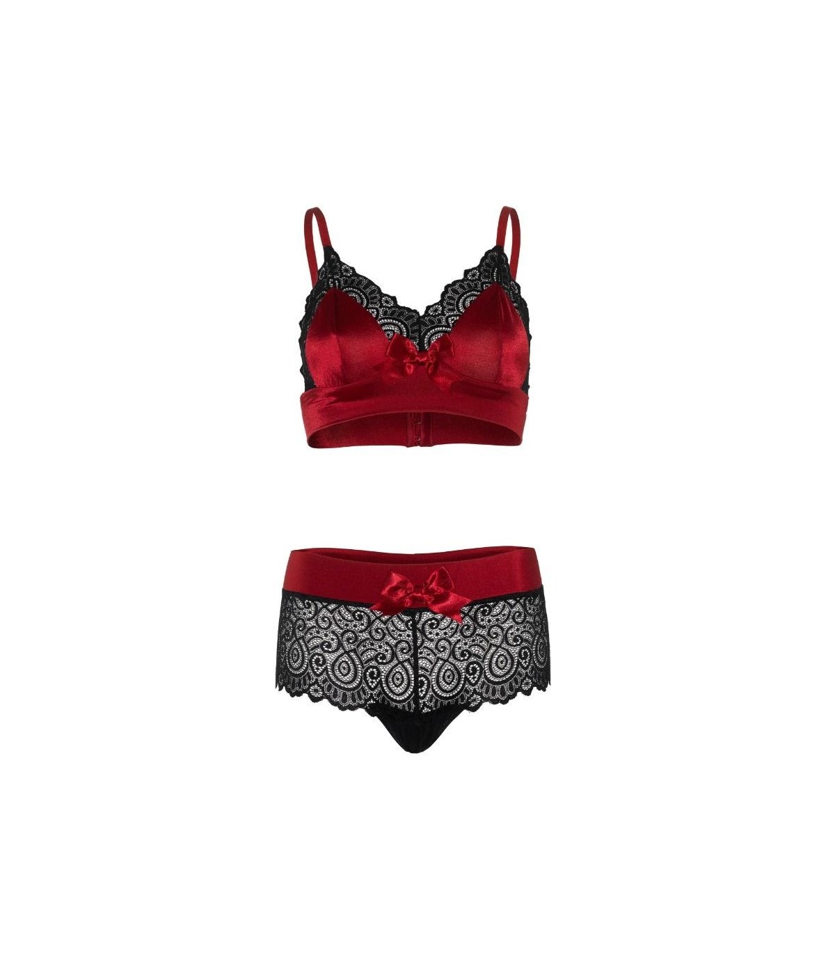Conjunto de 2 piezas de encaje y satén suave, braguita hipster con escudete de algodón y sujetador con tirantes ajustables y cierre cinta corchetera fabricado por la prestigiosa marca de lencería Leg Avenue.