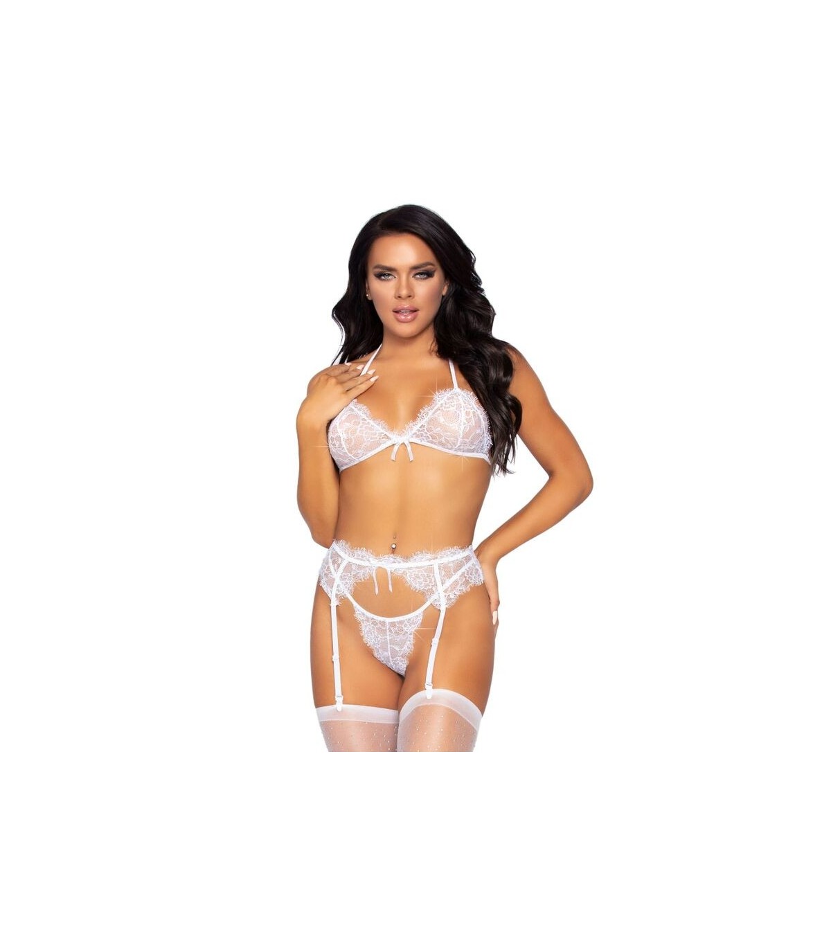 Conjunto de encaje y strass que incluye un sujetador, un liguero y un tanga. Con Leg Avenue reforzarás tu feminidad y obtendrás ese toque justo de seducción, sensualidad y elegancia.