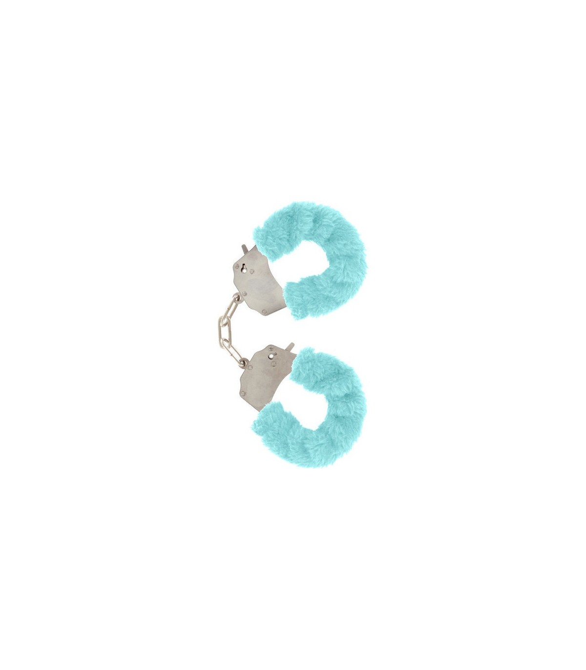 Fabulosas espoesas de muñeca de dos piezas unidas con una cadena de acero cromado, recubiertas con un suave peluche alrededor de los puños de color azul.