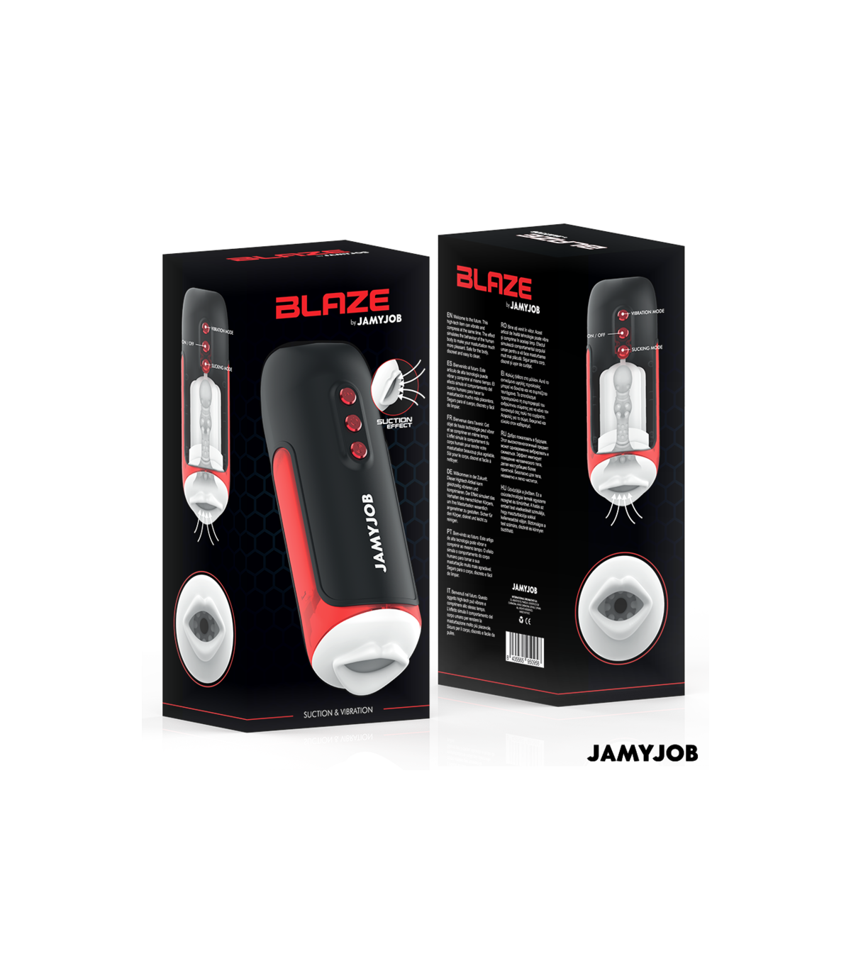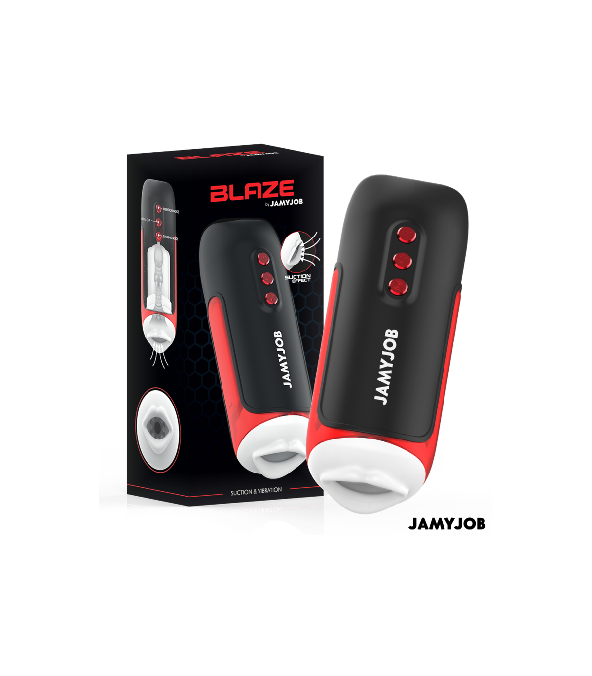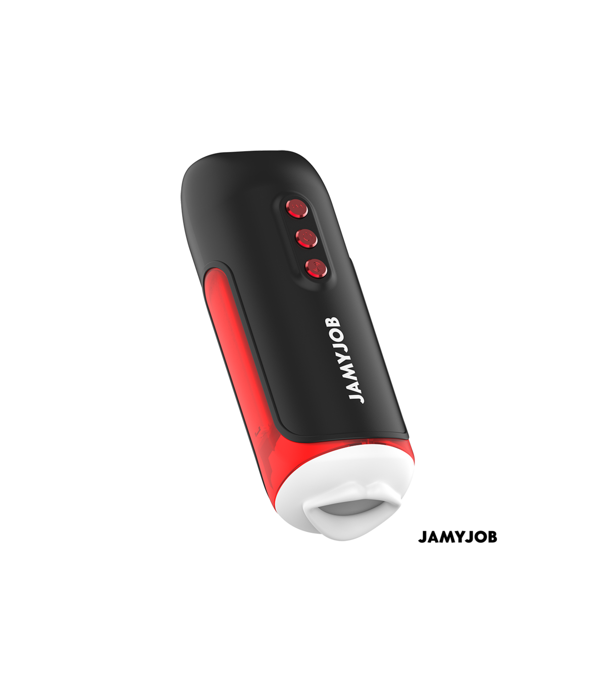 El masturbador automático con forma de boca para hombre BLAZE de la marca JAMYJOB es un dispositivo innovador y elegante, diseñado para proporcionar una experiencia estimulante y placentera de alta calidad. Con un diseño en color negro y rojo y detalles en rojo, este masturbador combina estética y funcionalidad en un solo producto.