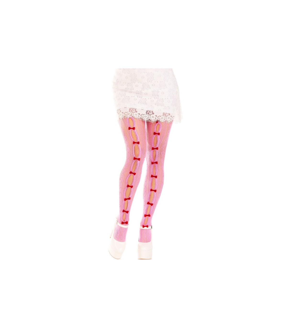 - Medias de red a rayas con escote en forma de corazón y detalle de minilazo