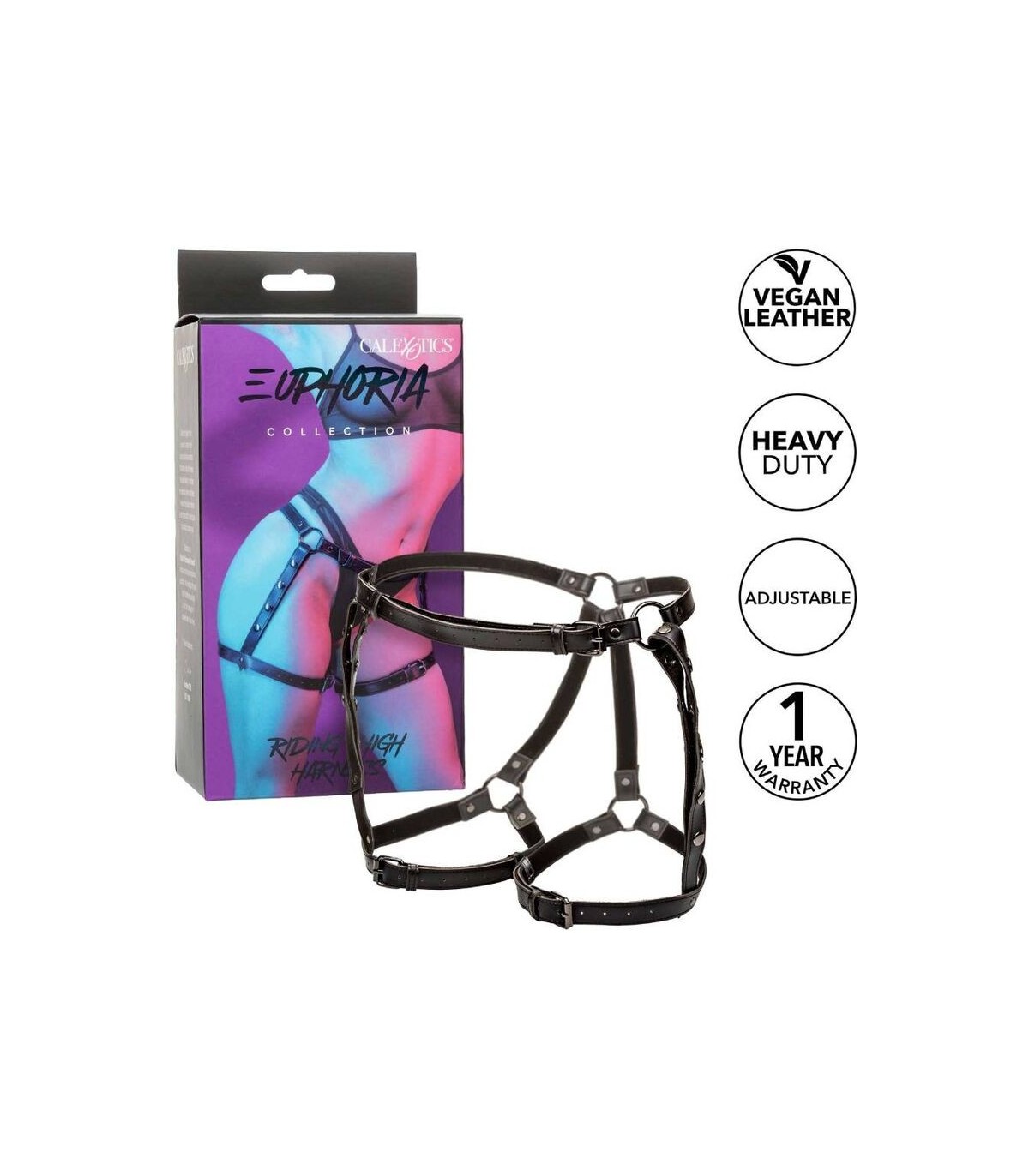 Experimenta la emoción con el Arnés de Muslo Riding de la Colección Euphoria, un accesorio premium para momentos estimulantes. Perfecto para encuentros íntimos o para agregar estilo a tus atuendos, este arnés de estilo equitación hace una declaración audaz. Las correas ajustables a la cintura y los muslos con cierres de hebilla seguros garantizan un ajuste cómodo, permitiéndote centrarte en el placer y el estilo. El diseño contemporáneo garantiza durabilidad, mientras que el suave interior de terciopelo y el exterior de cuero vegano proporcionan una sensación lujosa. El doble acolchado y las costuras ofrecen comodidad y resistencia para tus aventuras más salvajes. Adornado con acentos metálicos que no se empañan, este arnés de muslo añade un toque elegante y refinado, apto para la mayoría de los tamaños estándar, aportando emoción a tus encuentros.