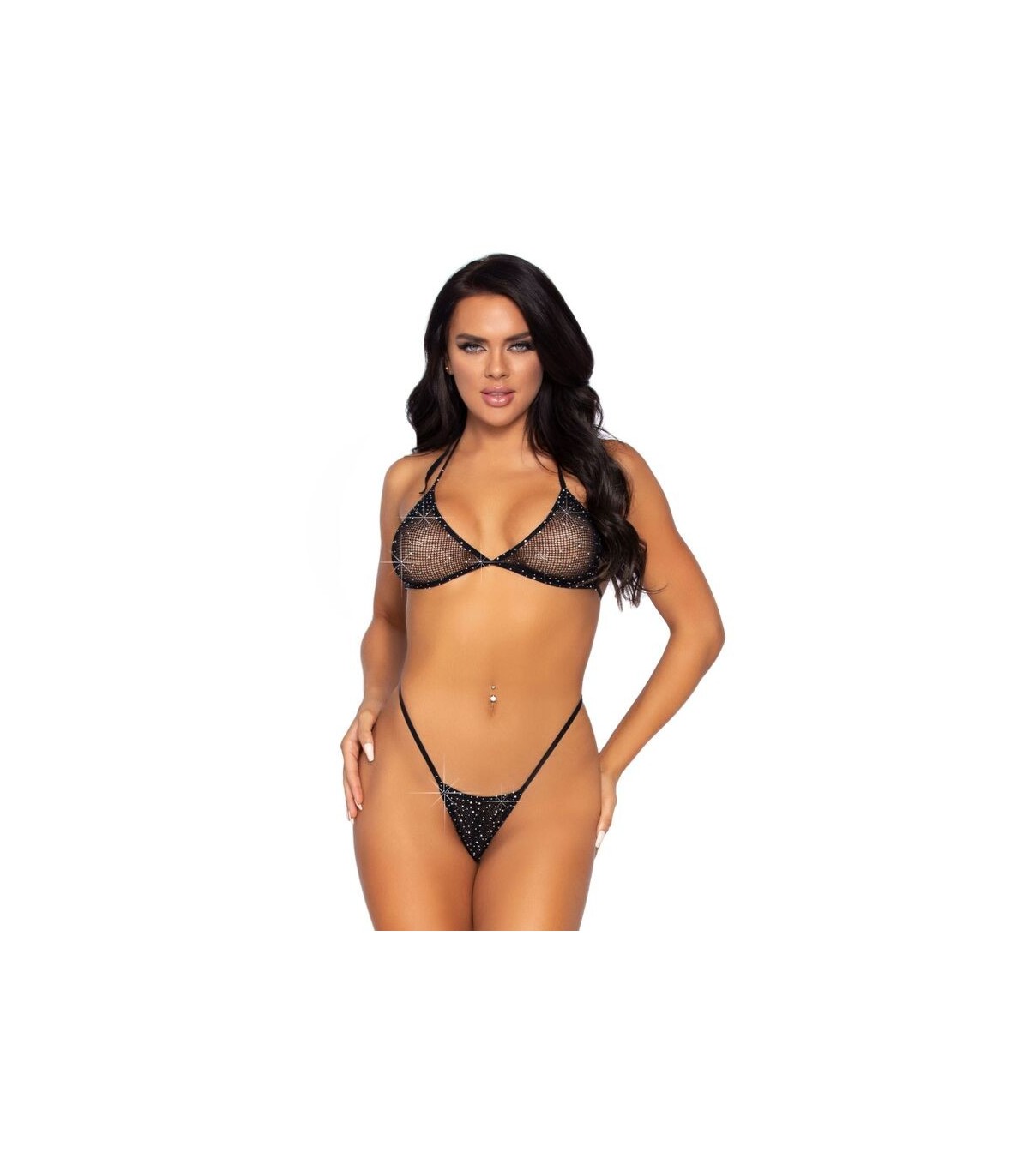 2 pzs. Conjunto de rejilla y strass que incluye un top de bikini y un tanga. Con Leg Avenue reforzarás tu feminidad y obtendrás ese toque justo de seducción, sensualidad y elegancia.