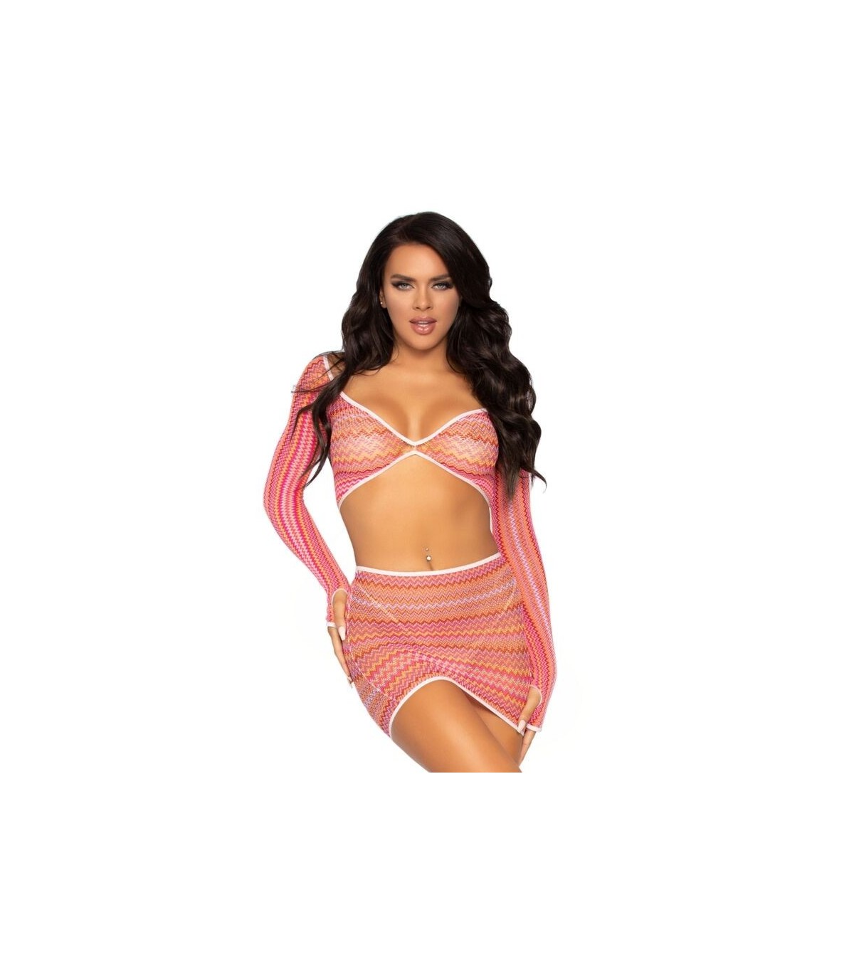 2 pzs. Conjunto de rejilla en zigzag que incluye una minifalda y un top corto con mangas largas y agujero para el pulgar. Con Leg Avenue reforzarás tu feminidad y obtendrás ese toque justo de seducción, sensualidad y elegancia.