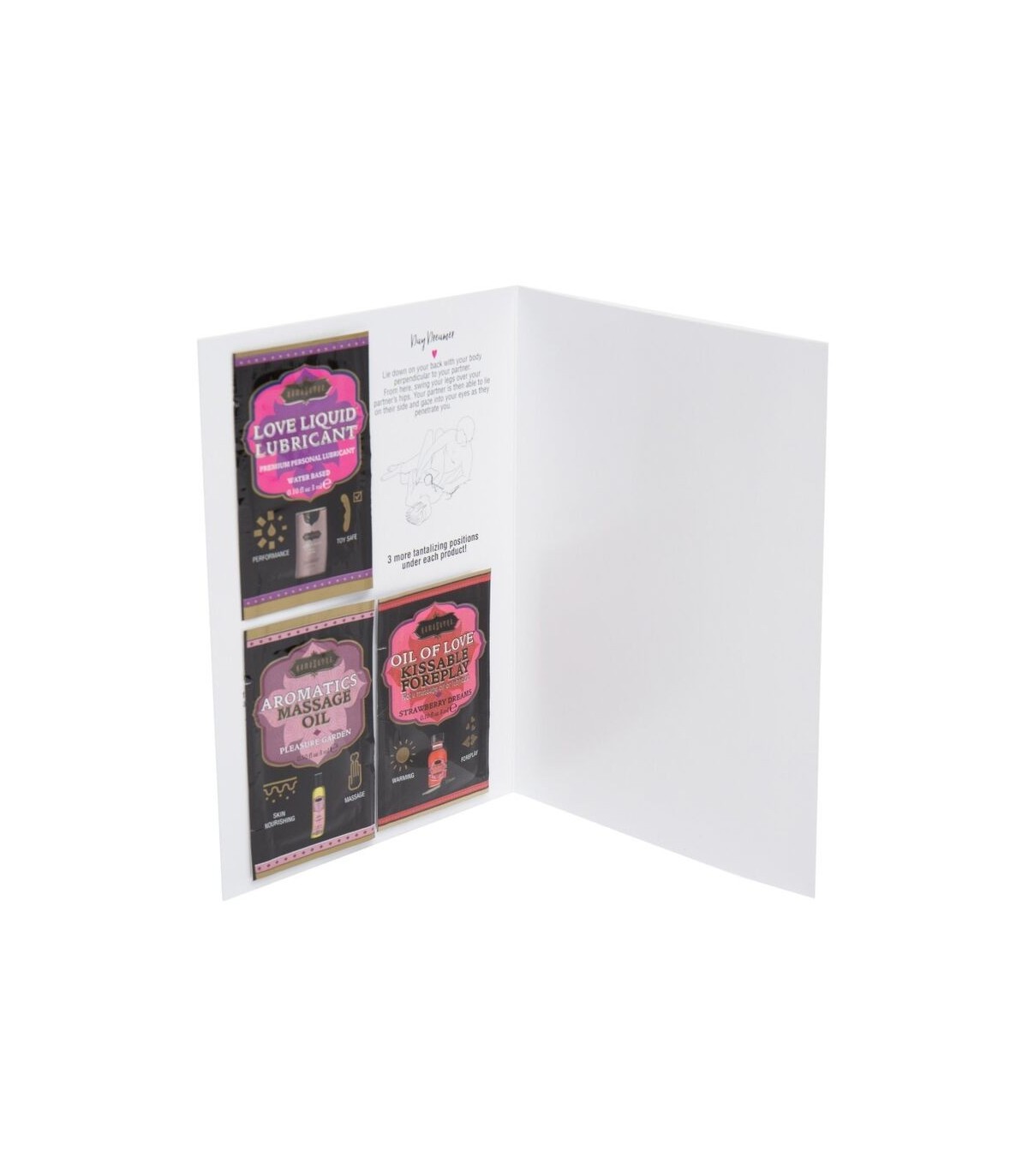 Incluye 3 productos tentadores para inspirar el deseo. Cada tarjeta cuenta con un mensaje, 4 posiciones kamasutra y 3 sachets