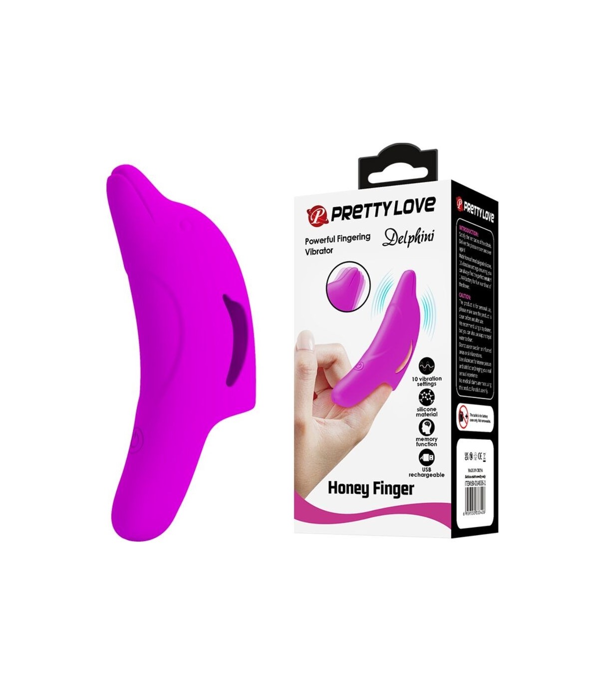 Seguro para el cuerpo y fácil de limpiar, siente tu camino hacia la cima con este vibrador de dedo de 10 funciones de silicona de delfín de Pretty Love.