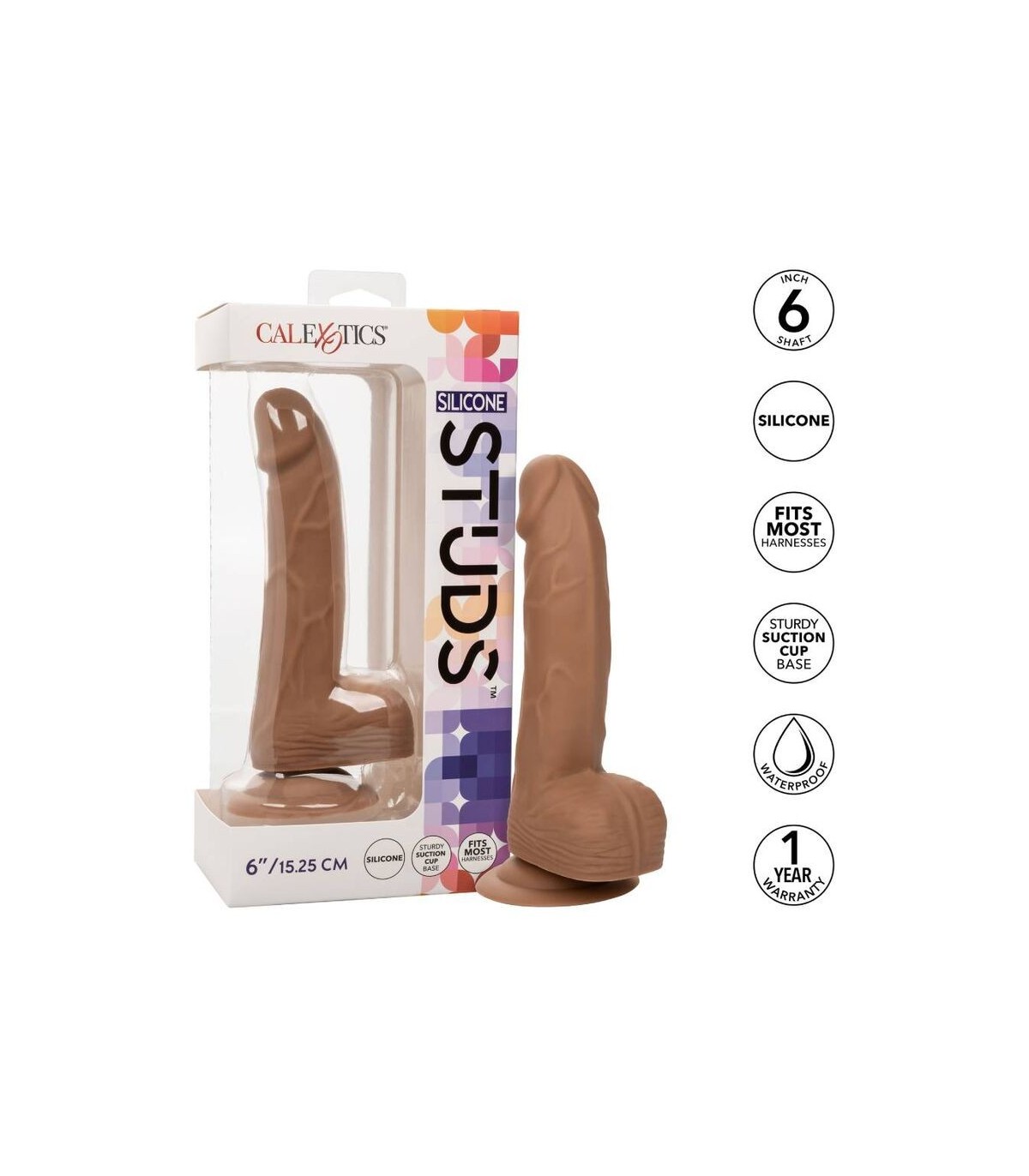 Se trata del tamaño de su placer y el Calexotics Silicone Studs 6 ha llegado para ofrecer una experiencia de golpe para cualquier tamaño queen. El dong real se crea con un amplio eje de 6 pulgadas, un diseño flexible realista y una base de taza de succión. Entregue el placer que ha estado ansiando con un dong de 6 pulgadas de largo con punta sensual, eje texturizado y bolas realistas. El eje texturizado tiene una sensación firme pero flexible que seguramente ofrecerá una experiencia de penetración verdaderamente realista. La base con bridas tiene una resistencia de succión que se puede usar en un arnés o montar en una superficie plana para una diversión sensacional con manos libres .