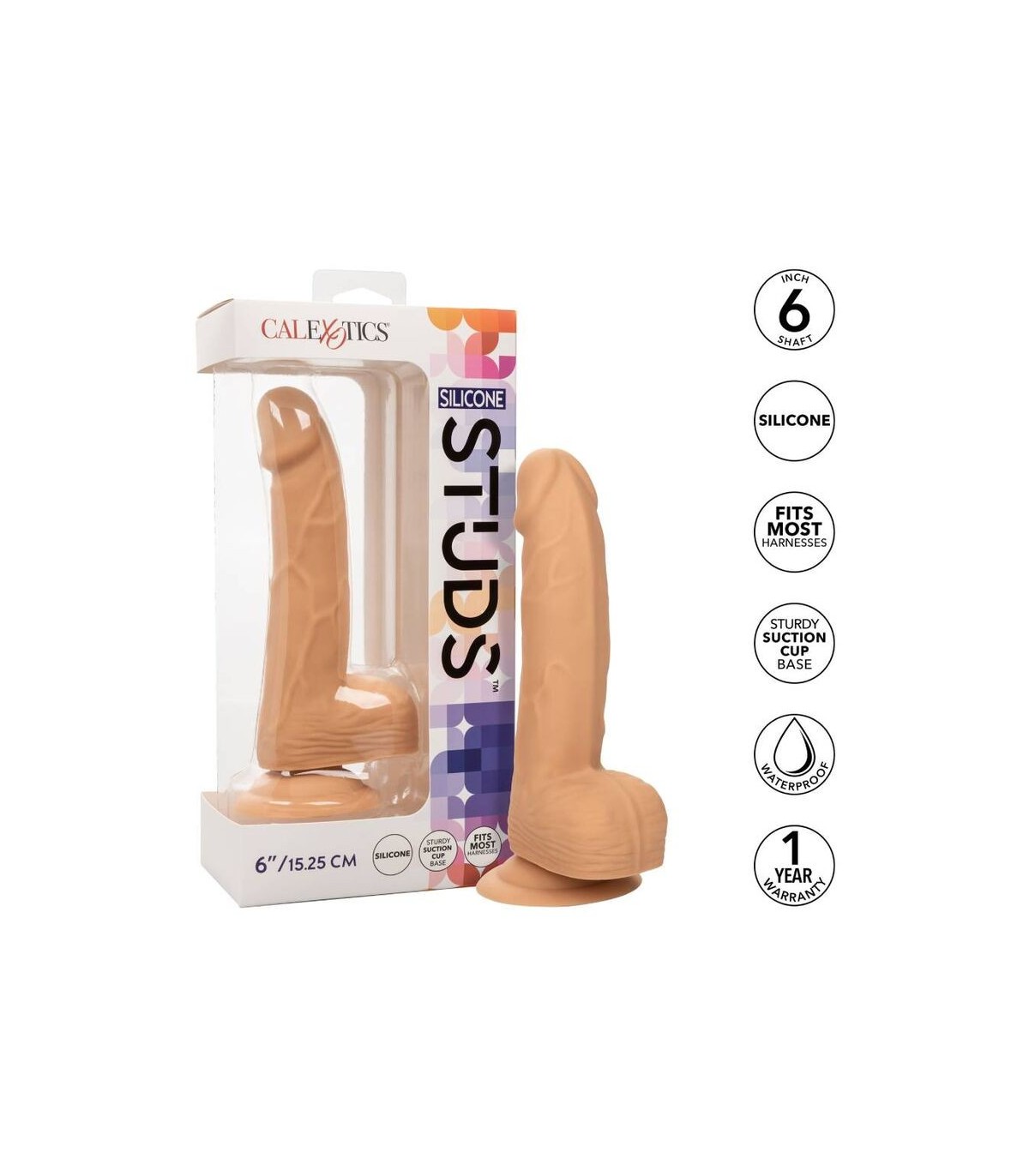 Se trata del tamaño de su placer y el Calexotics Silicone Studs 6 ha llegado para ofrecer una experiencia de golpe para cualquier tamaño queen. El dong real se crea con un amplio eje de 6 pulgadas, un diseño flexible realista y una base de taza de succión. Entregue el placer que ha estado ansiando con un dong de 6 pulgadas de largo con punta sensual, eje texturizado y bolas realistas. El eje texturizado tiene una sensación firme pero flexible que seguramente ofrecerá una experiencia de penetración verdaderamente realista. La base con bridas tiene una resistencia de succión que se puede usar en un arnés o montar en una superficie plana para una diversión sensacional con manos libres .