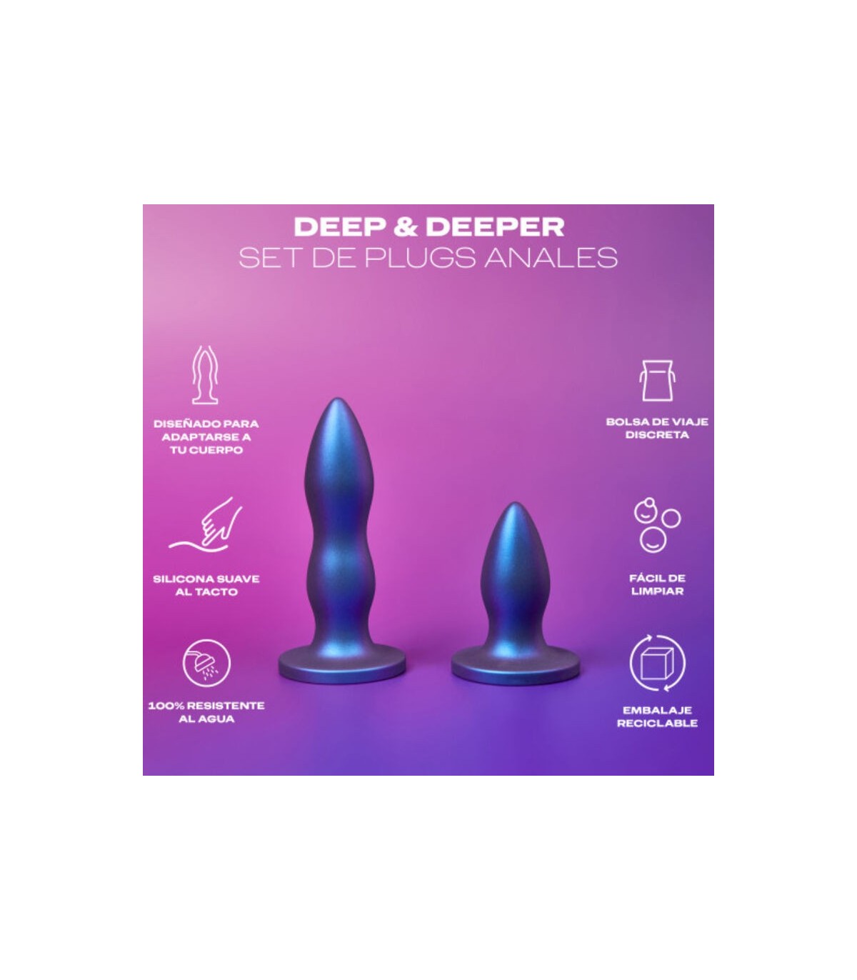 Deep & Deeper es el set de plugs anales de Durex diseñado para aumentar la diversión del juego anal. ¡Lubrícate generosamente tanto a ti como al Deep & Deeper con cualquier lubricante Durex a base de agua! Relájate completamente, tómate tu tiempo y sé suave.