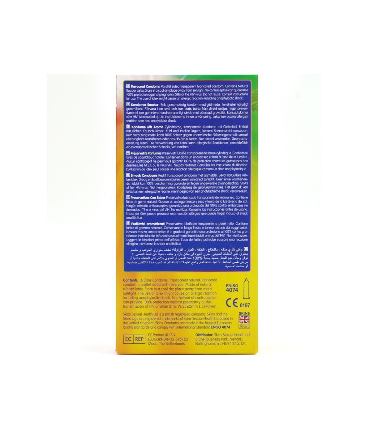 Presentamos el pack de 16 con sabor Skins: una solución elegante y lista para usar que ofrece hasta un 33 % más de condones por pack que el líder del mercado. Este emocionante multipack incluye cuatro atractivos sabores: plátano, chicle, menta y fresa, ofreciendo a los consumidores una forma divertida y sabrosa de mejorar la intimidad en cualquier ocasión. Cada condón está envuelto individualmente y elaborado con látex natural de primera calidad, lo que proporciona una sensación natural, transparencia y resistencia. Enriquecidos con lubricación extra y deliciosas fragancias, estos condones eliminan el olor típico del látex para garantizar una experiencia más placentera.