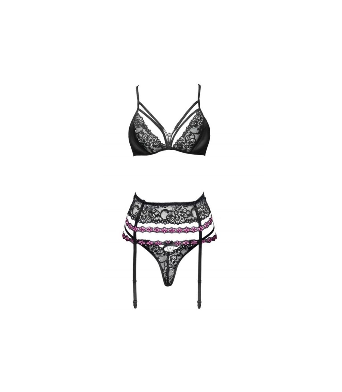 Un conjunto de lencería exclusivo y elegante confeccionado con un intrincado encaje negro. Un coqueto sujetador de finos tirantes que se cruzan en la espalda, decorado con tirantes y bisutería plateada. Elegante liguero atado en la espalda con una cinta de raso. Un adorno adicional son dos cintas de flores rosas. El set incluye un tentador tanga con un pequeño corazón plateado.