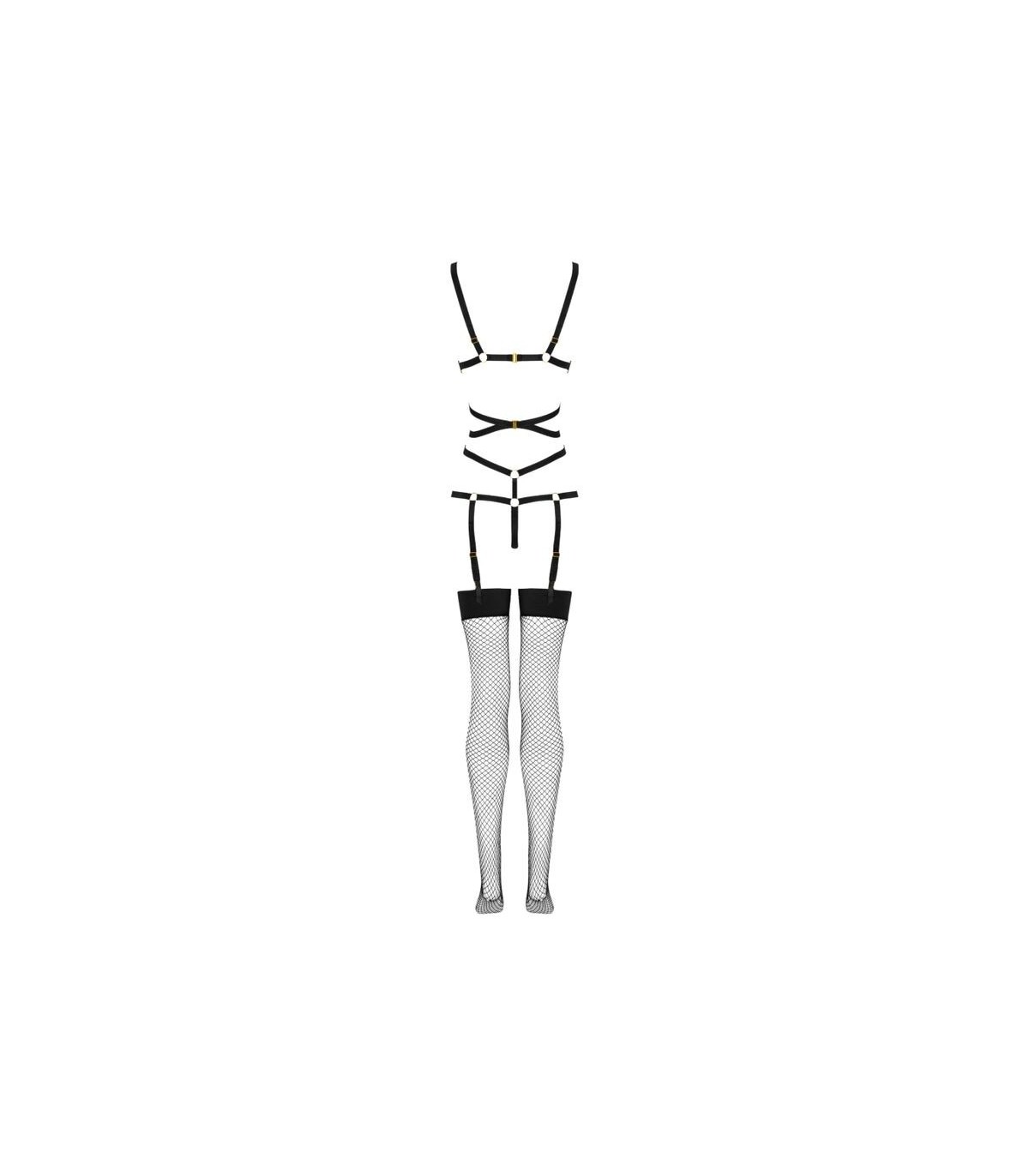 La parte superior del conjunto consta de sexys rayas negras, entrelazadas en el vientre y conectadas con anillos. Los tirantes de la parte superior rodean elegantemente el busto sin cubrirlo, mientras que en la parte inferior se transforman suavemente en un tanga. Tiras individuales corren a ambos lados del tanga, abrazando encantadoramente las caderas. La parte inferior del conjunto se compone de medias negras de largo regulable, confeccionadas en malla. Las medias se sujetan con broches al elemento superior del conjunto, por delante y por detrás.