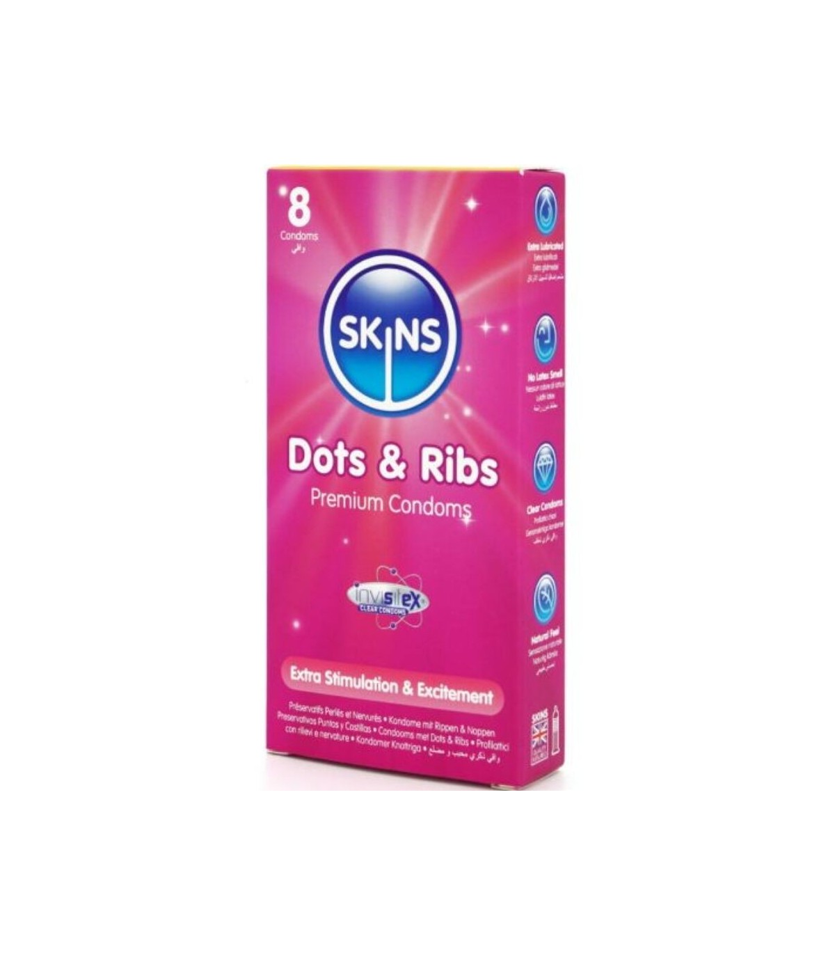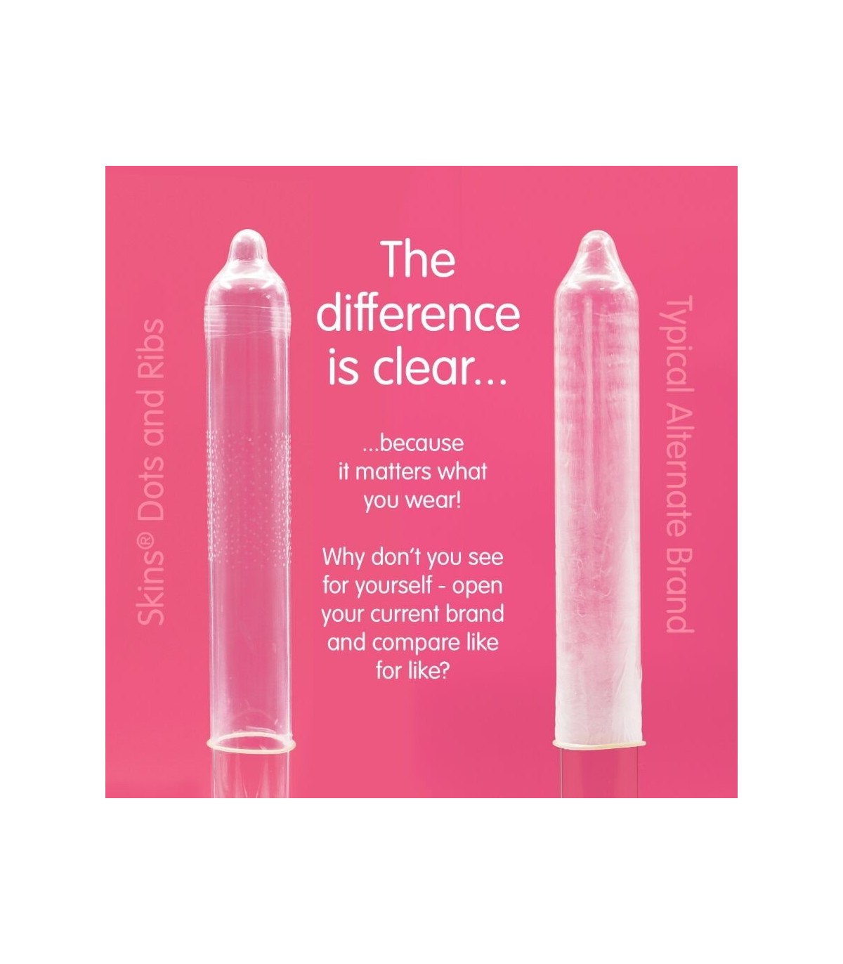 Mejora tu oferta de condones con el nuevo Skins Dots & Ribs 8-Pack, un producto listo para usar que ofrece un rendimiento superior y un mayor valor. Con hasta un 33 % más de condones por paquete que el líder del mercado, este producto es perfecto para minoristas que buscan aumentar la satisfacción del cliente y el valor de la compra. Diseñados para el placer mutuo, los condones Skins Dots & Ribs presentan estrías elevadas y puntos texturizados estratégicamente ubicados. Las estrías mejoran la estimulación del usuario, mientras que los puntos están diseñados para intensificar la sensación en la pareja, trabajando en conjunto para aumentar el placer para ambos. Fabricados con látex natural de primera calidad y ultrafinos para una sensación de segunda piel, estos condones ofrecen resistencia, claridad y comodidad excepcionales.