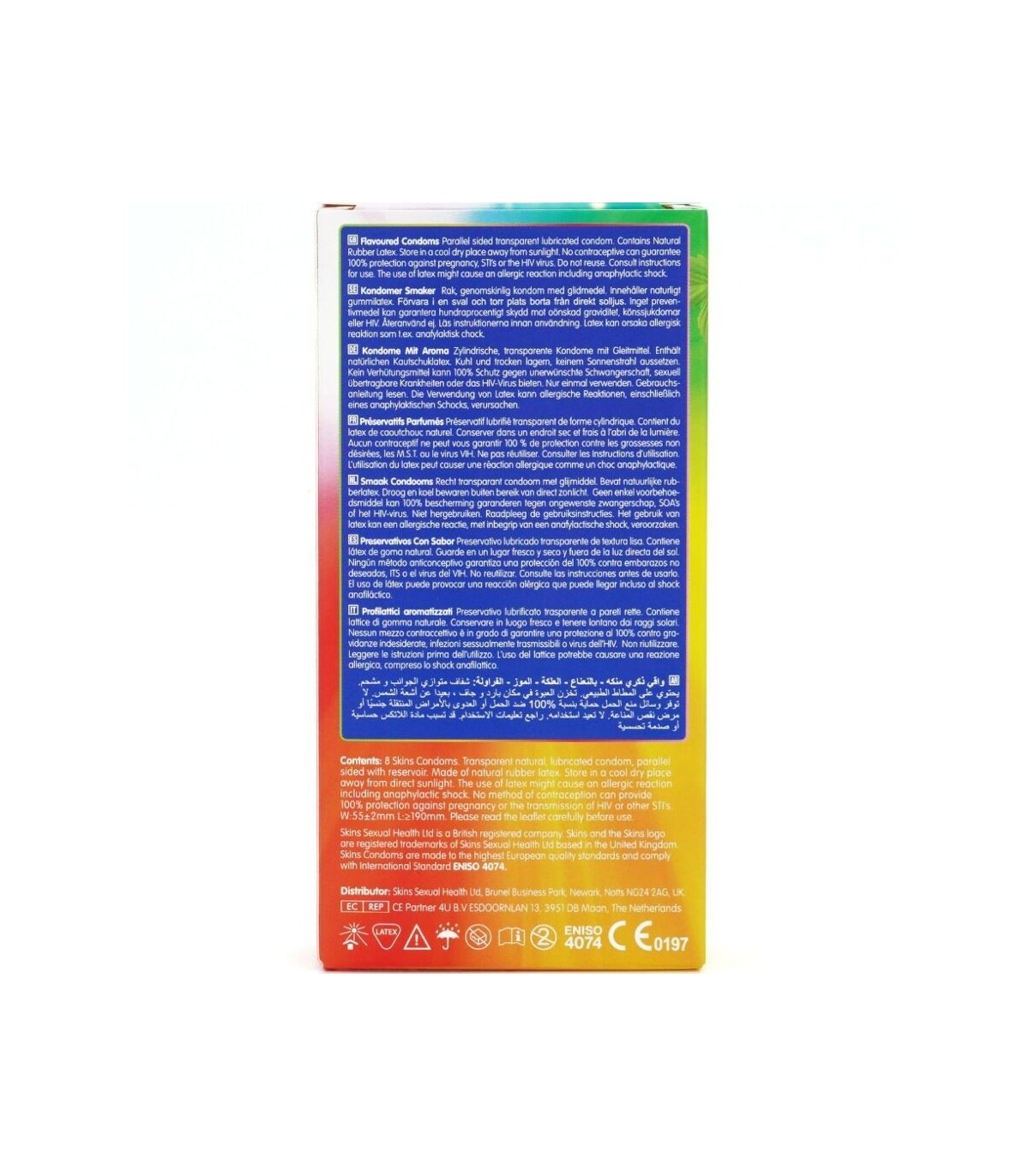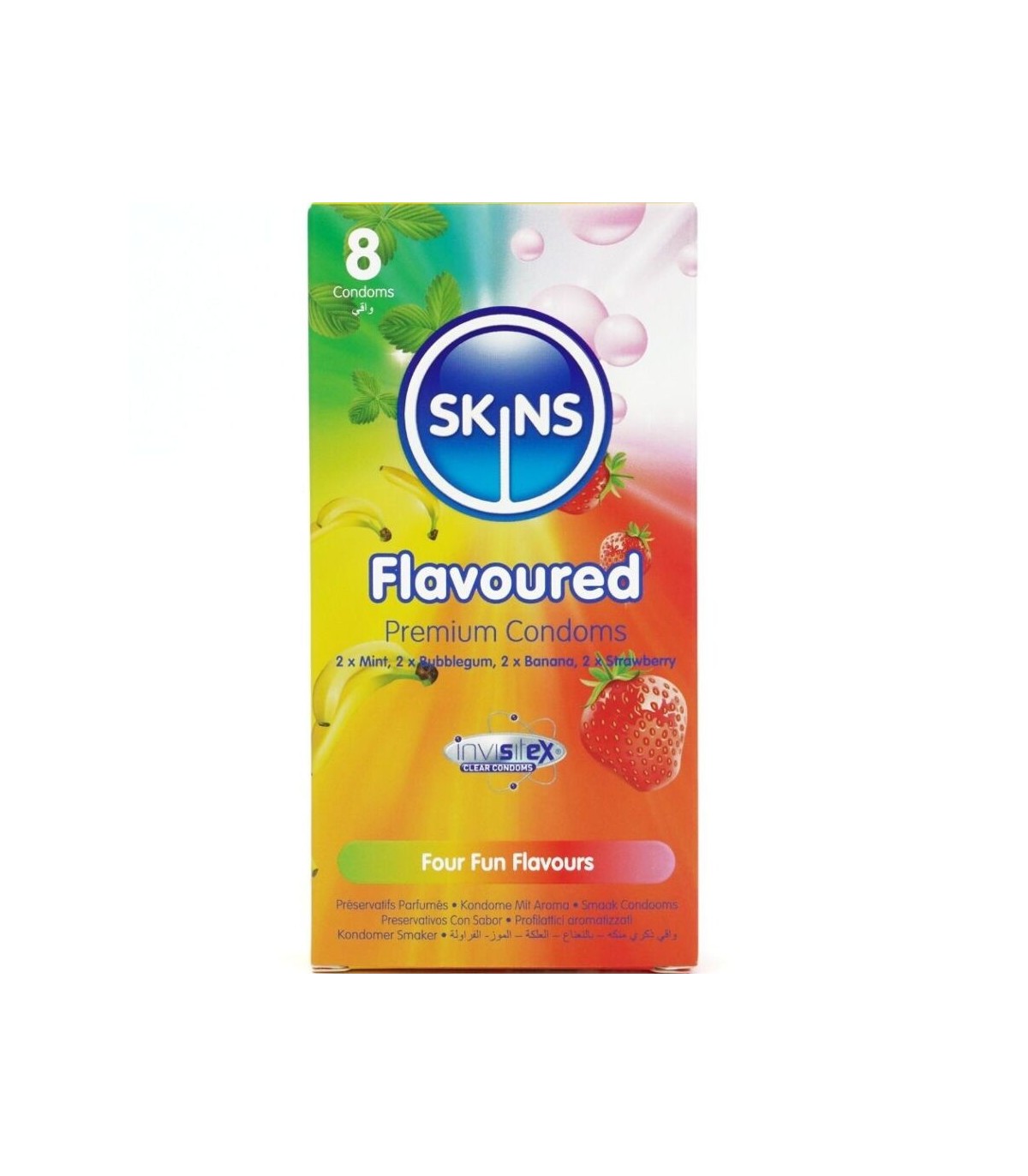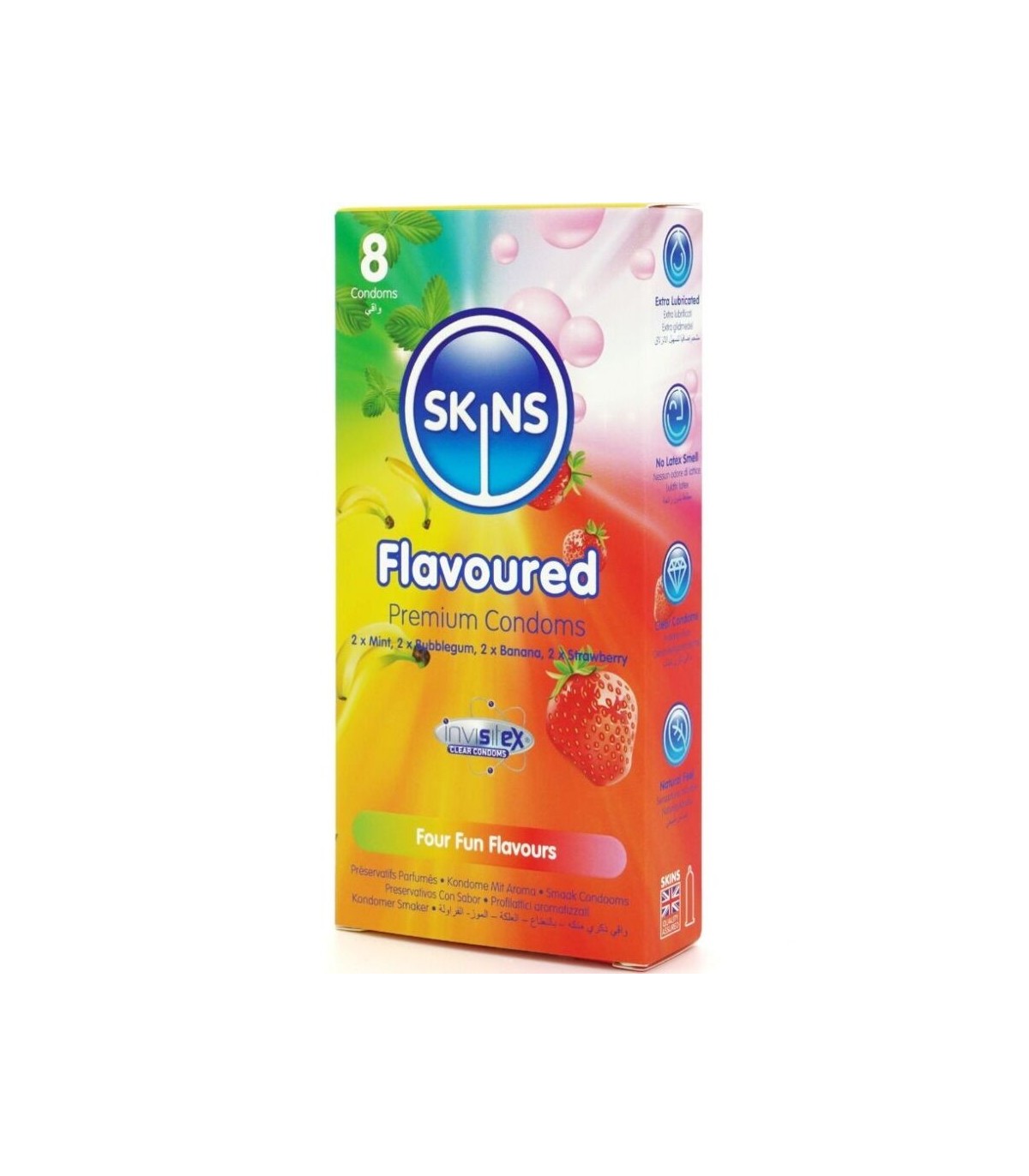 Presentamos el pack de 8 con sabor Skins: una solución elegante y lista para usar que ofrece hasta un 33 % más de condones por pack que el líder del mercado. Este emocionante multipack incluye cuatro atractivos sabores: plátano, chicle, menta y fresa, ofreciendo a los consumidores una forma divertida y sabrosa de mejorar la intimidad en cualquier ocasión. Cada condón está envuelto individualmente y elaborado con látex natural de primera calidad, lo que proporciona una sensación natural, transparencia y resistencia. Enriquecidos con lubricación extra y deliciosas fragancias, estos condones eliminan el olor típico del látex para garantizar una experiencia más placentera.