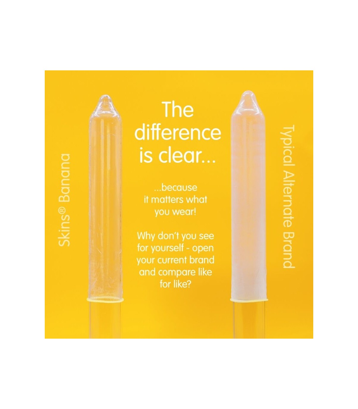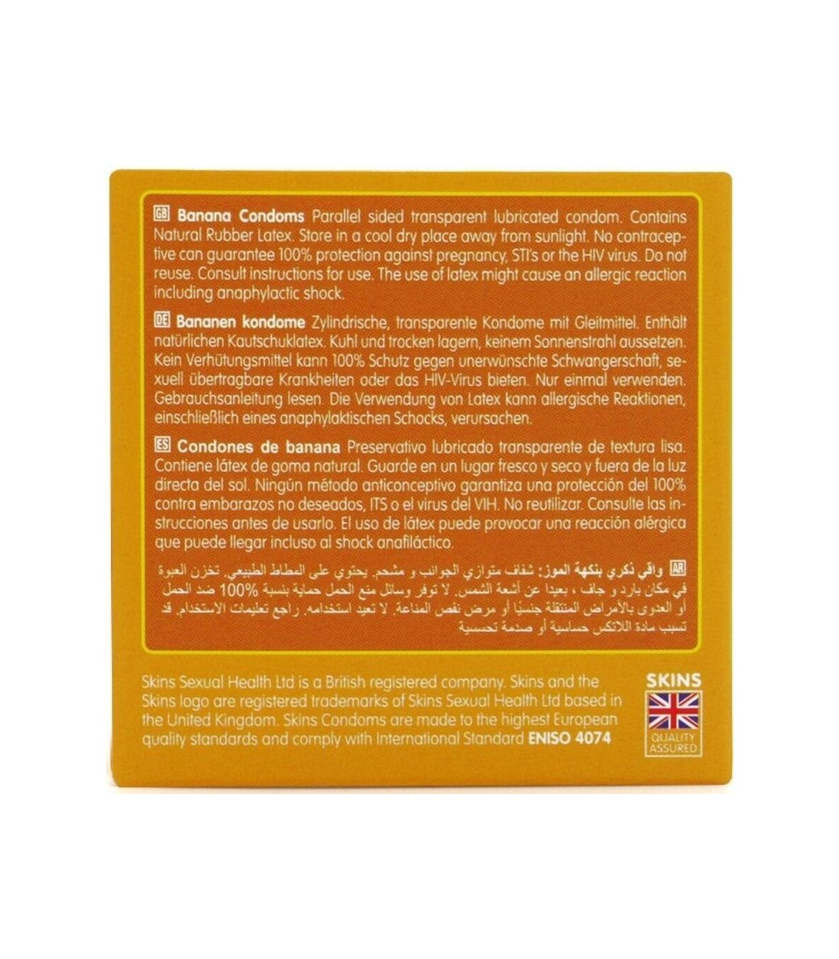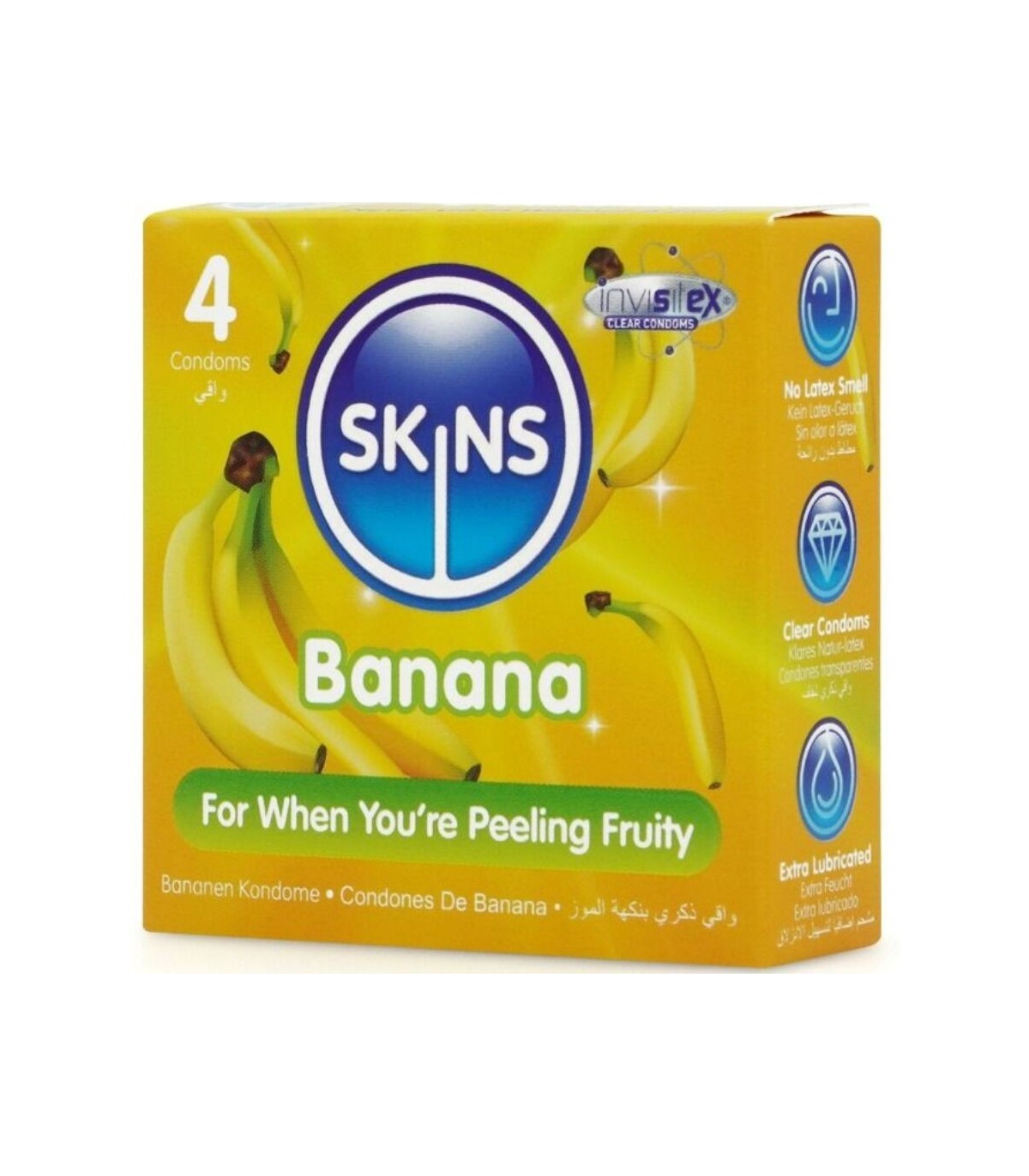 ¡Deleite su paladar con la sensación de sabor de los condones Skins sabor plátano! 4 condones con sabor a plátano envueltos individualmente para facilitar su uso. ¡Luce bien! ¡Siéntete bien! Disfruta de un sexo naturalmente mejor con un condón que se siente como parte de ti. Tan transparente y fino que se siente como una segunda piel. ¡Los condones Skins te permiten disfrutar de forma segura sin sacrificar el placer!