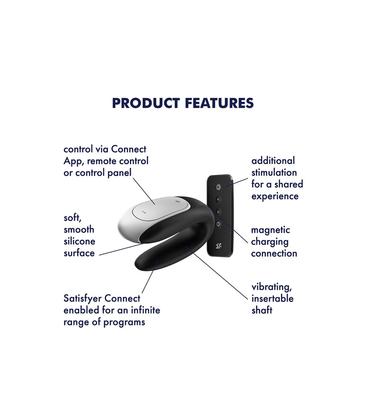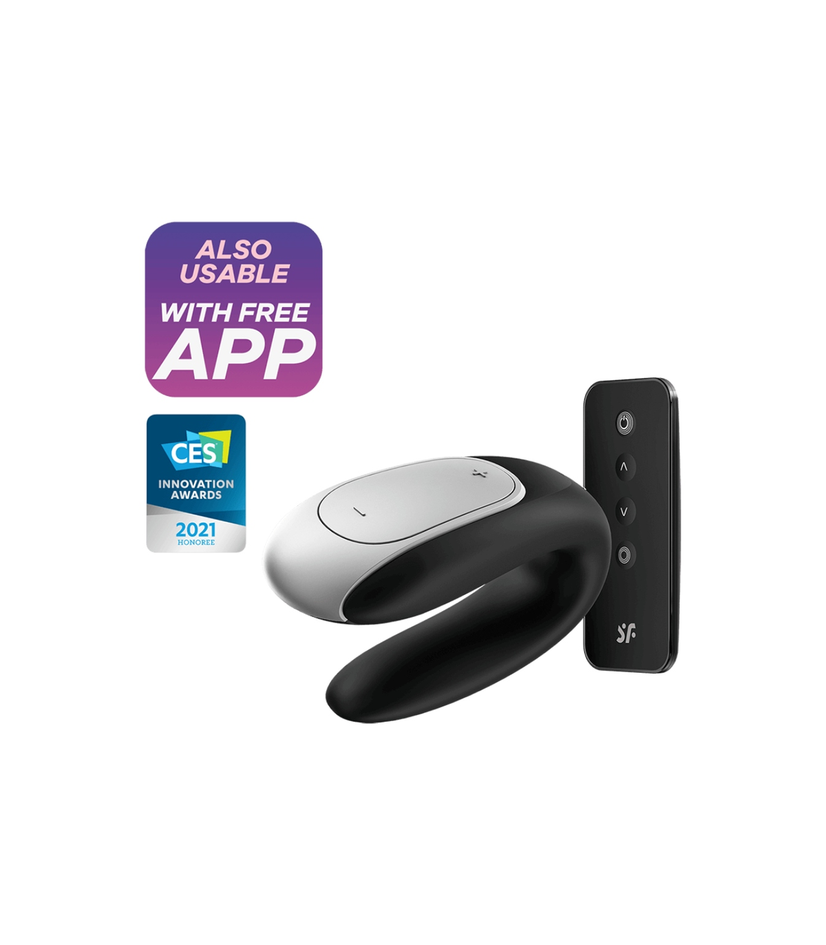 También cuenta con un control intuitivo: Los diferentes programas de vibración se pueden controlar mediante los botones de control del propio vibrador para parejas, con el control remoto inalámbrico incluido o a través de la aplicación Satisfyer Connect. A través de la aplicación podrás descubrir todavía más posibilidades de mejorar el juego sexual: Tienes la posibilidad, entre otras cosas, de crear tus propios programas de vibración, asumir el control del Satisfyer de tu pareja o conectar la cuenta a Spotify: ¡hay tanto por descubrir! La aplicación es gratuita y está disponible para Android, iOS y Apple Watch.