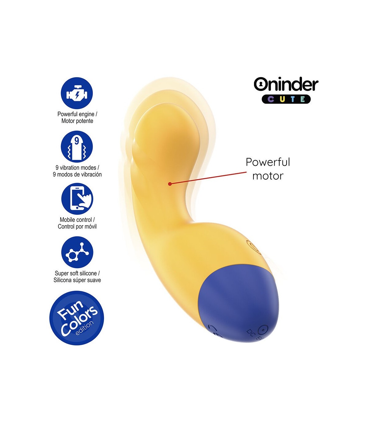 Con un tamaño ideal de 14 cm de longitud total y 3 cm de diámetro, este vibrador es perfecto tanto para la estimulación interna como externa. Su forma estilizada y ergonómica se adapta cómodamente a la mano y al cuerpo. Además, su combinación de amarillo vibrante con base azul oscuro le otorga un estilo llamativo y moderno, acorde con la colección ONINDER CUTE.