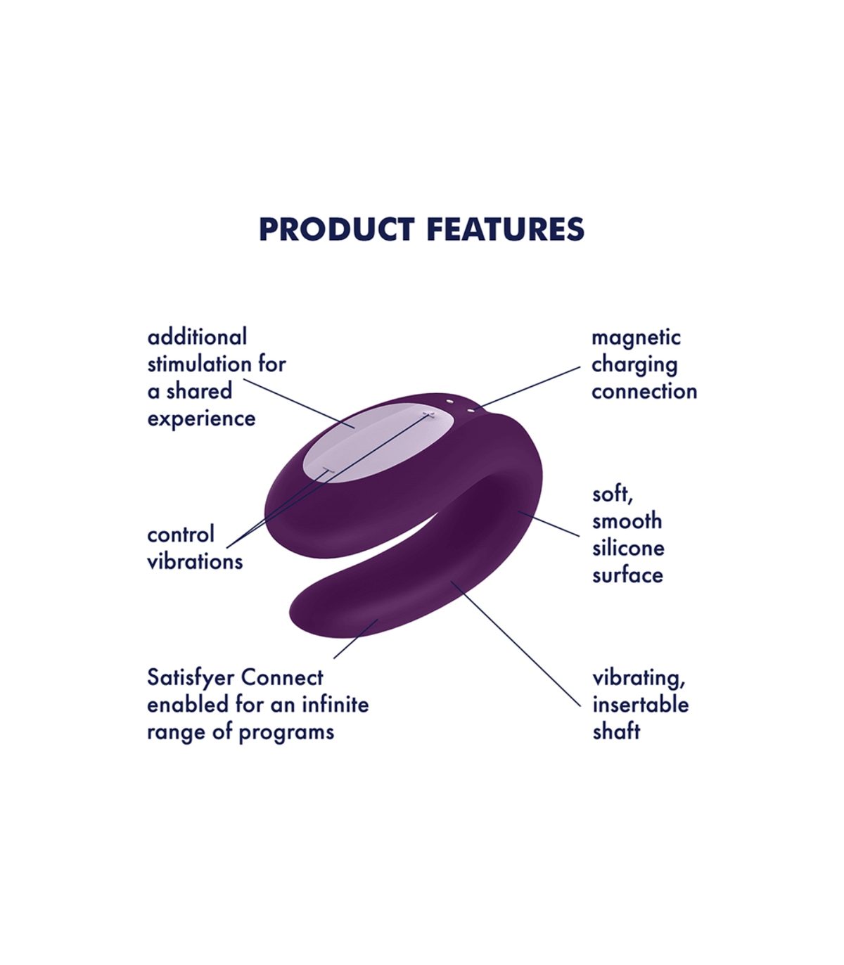 Double Joy es un dispositivo flexible con forma de U que se puede utilizar durante el sexo con penetración junto a tu pareja. Con tecnología Bluetooth, Royal One y Double Joy se suman al ecosistema de productos que se conectan a la galardonada aplicación gratuita Satisfyer Connect, ofreciéndote la posibilidad de asumir el control del placer y comenzar tu viaje estés donde estés.
