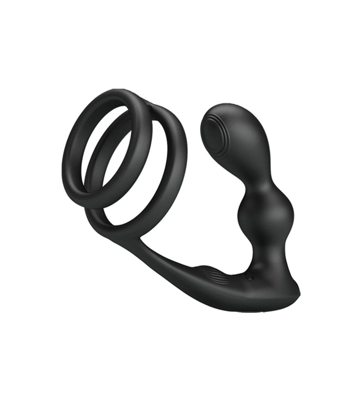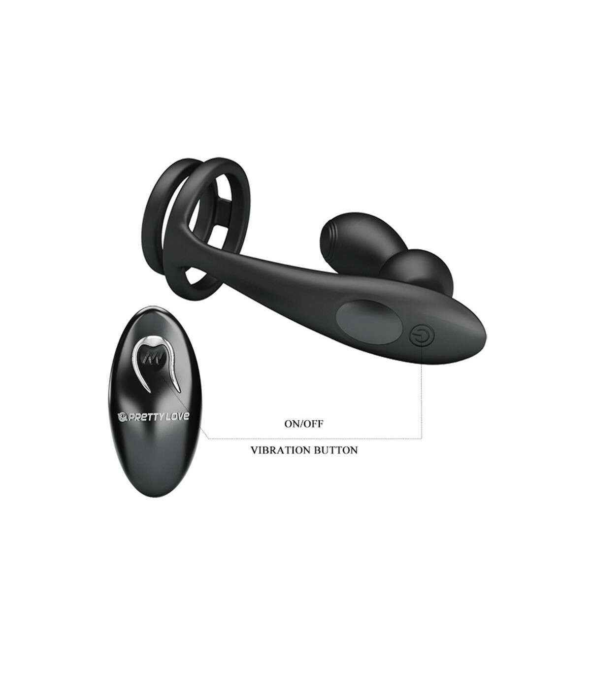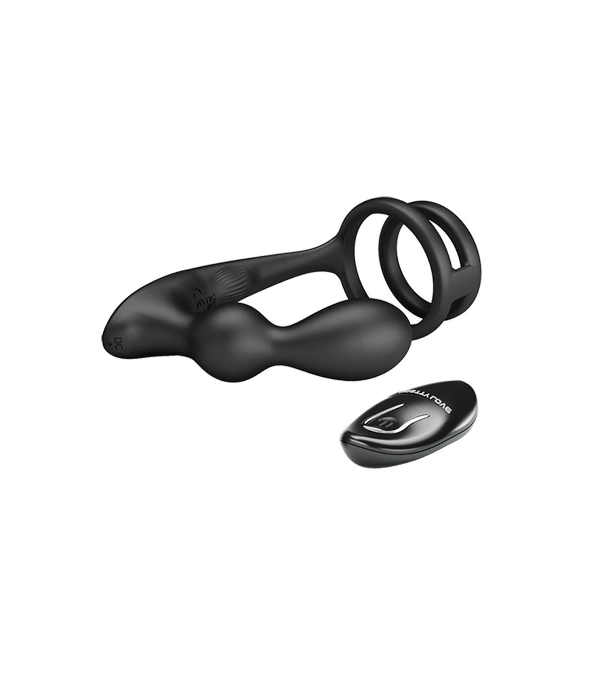 Este anillo para el pene con plug anal con control remoto es un anillo combinado para el pene y el plug anal vibratorio sujeto de forma segura.