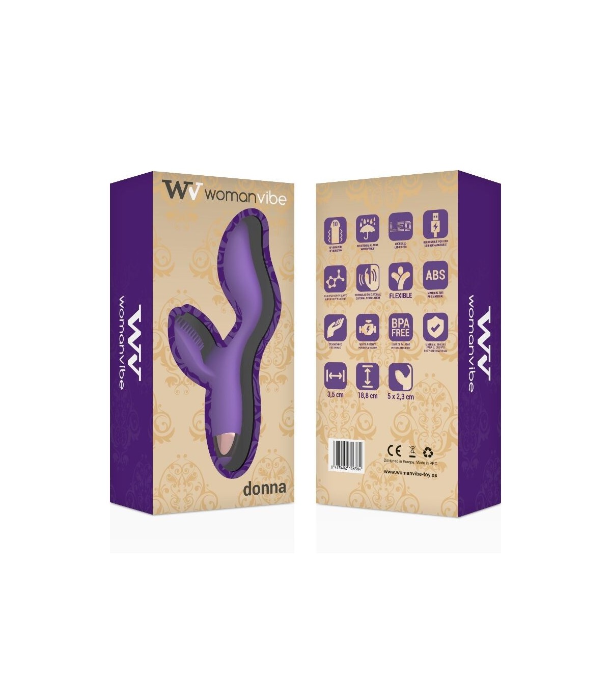 Womanvibe Donna, un vibrador con motor dual que ofrece estimulación intensa, en una forma elegante y agradable. Donna es perfecto para una masturbación que te eleve al máximo placer con un diseño elegante en color Lila y Dorado ofrece dos motores, uno en su cabezal y otro el clítoris, además el estimulador clitorial tiene puntas en relieve de silicona que transmiten mayor fuerza a la vibración. Donna incorpora silicona libre de falatos 100% seguro para tu piel y detalles en Abs, completamente flexible y muy agradable!