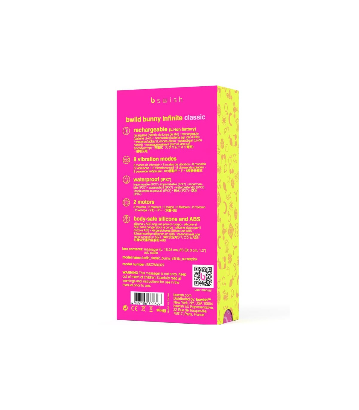 Nuestro Bwild Bunny Infinite Classic no se puede domesticar. Garantizado para complacer y diseñado para satisfacer, tentar y estimular el punto G y el clítoris. 8 niveles de intensidad, USB magnético recargable, certificado IPX7 a prueba de agua y 100% seguro para el cuerpo: Bwild Bunny Infinite Classic es su BFFL más nuevo.