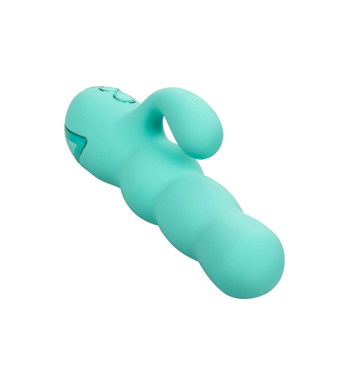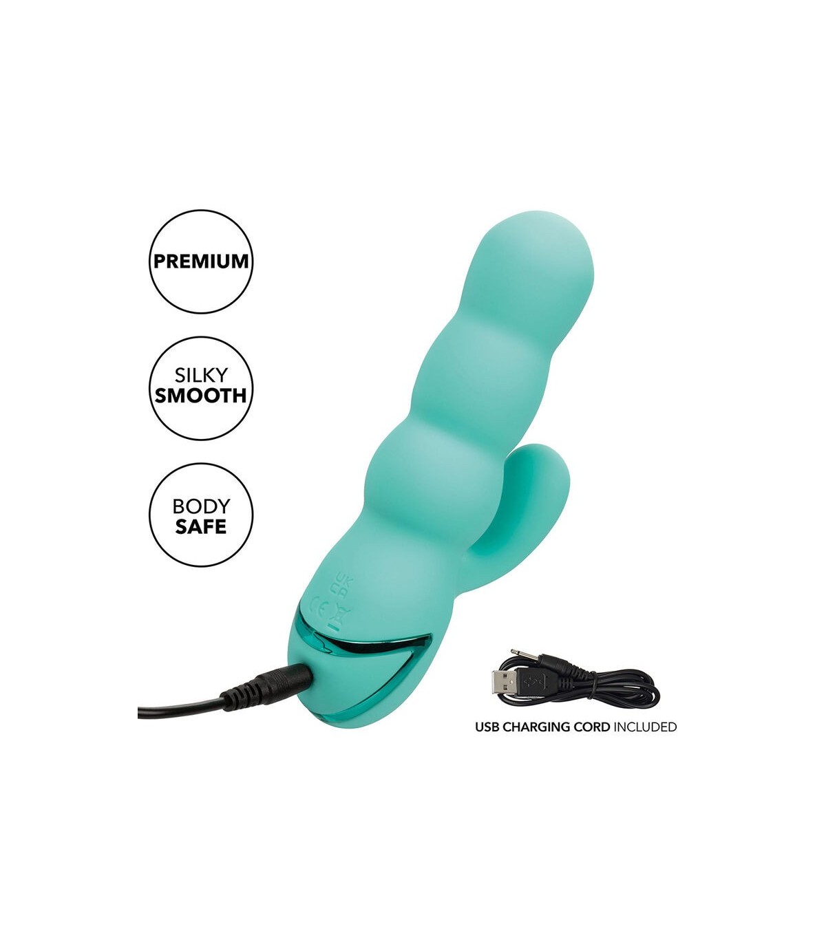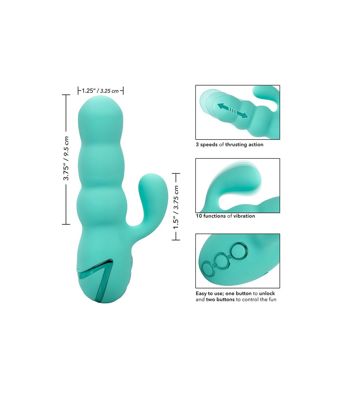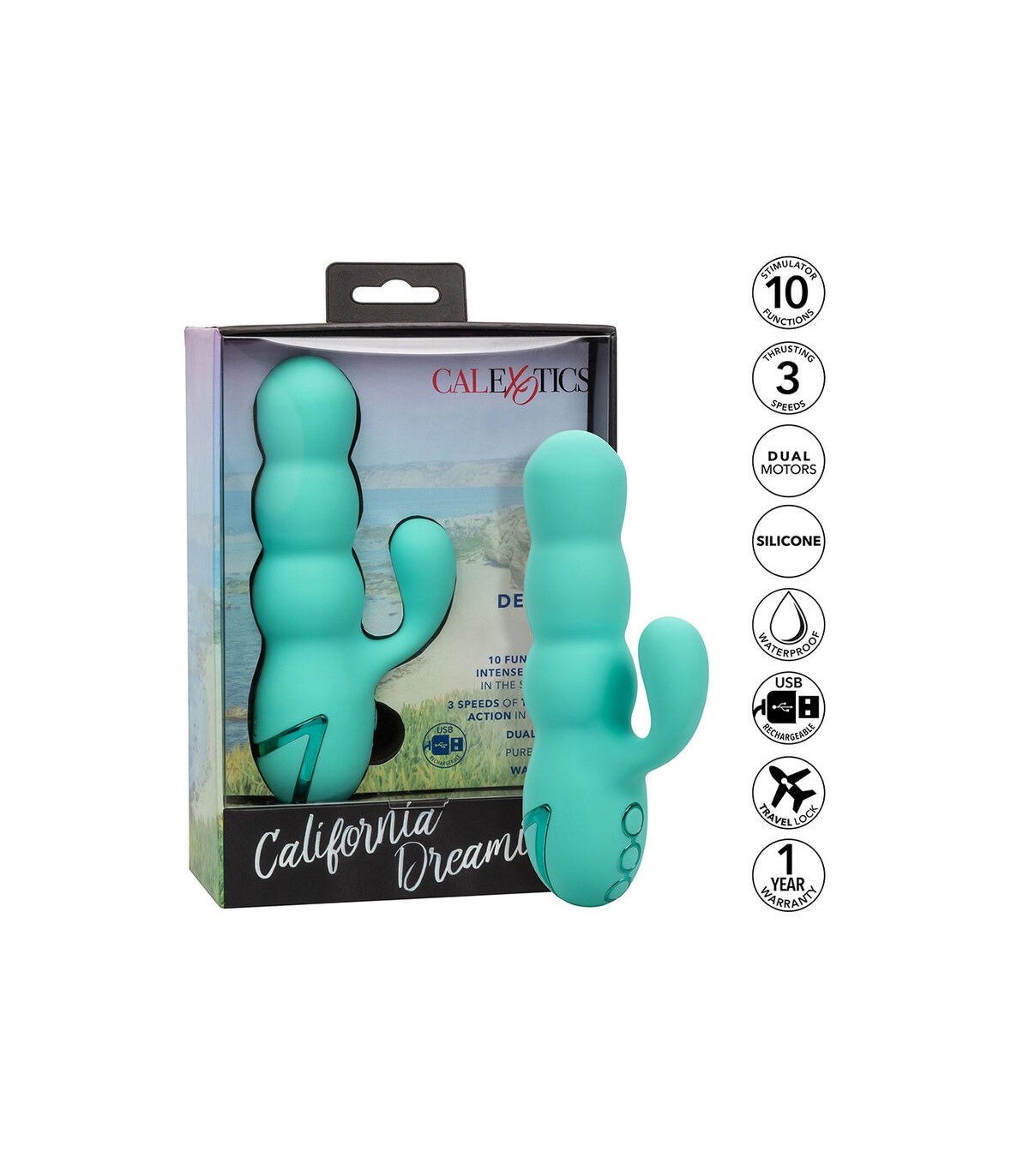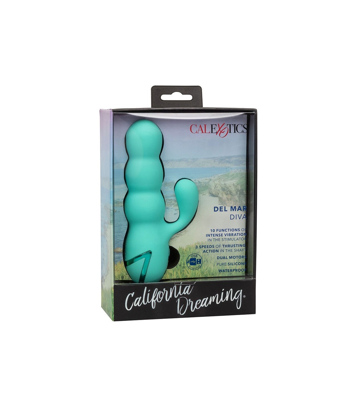 La divertida colección California Dreaming hace realidad fantasías de lujo con la atrevida Del Mar Diva. El potente masajeador está listo para revivir tus fantasías favoritas de aventuras veraniegas con 10 potentes funciones de vibración y 3 velocidades de empuje que hacen temblar las rodillas. Mientras el estimulador parpadeante provoca, el eje bulboso y la punta redondeada brindan una estimulación de empuje profundo. El eje tiene una poderosa acción de empuje para garantizar que siempre llegue al lugar correcto. El cosquilleo retumbante utiliza un potente motor de vibración para brindar una maravillosa estimulación externa. El teaser flexible se puede utilizar independientemente de la función de empuje para un placer totalmente personalizable. ¡Los giros que hacen temblar las rodillas en este ambiente divertido no son para los débiles de corazón! Los motores de doble potencia emiten profundas vibraciones y un potente empuje. Conecte el cable USB proporcionado al puerto de carga autosellante para recargar su pasión en 2,5 horas. Emociónate con hasta 90 minutos de intenso placer. Para controlar la estimulación sin esfuerzo, el elegante panel de control de 3 botones le permite operar de forma independiente las opciones de vibración y empuje. El chip de memoria de alta tecnología recuerda exactamente cómo le gusta y reanuda la reproducción con la última función utilizada.