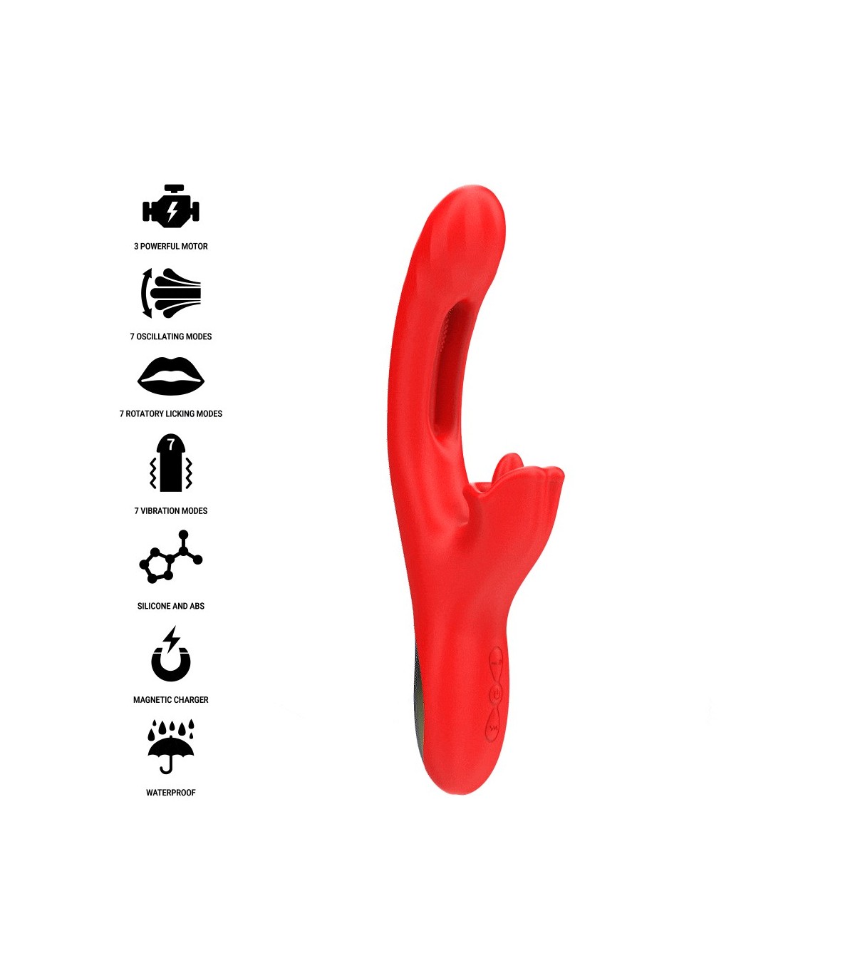 El estimulador clitorial cuenta con 7 modos de "licking" rotatorio, simulando delicadamente el movimiento de la lengua para una estimulación precisa e irresistible. Al mismo tiempo, su eje insertable incorpora 7 modos de oscilación interna, diseñados para masajear y estimular las paredes vaginales de forma rítmica y envolvente. A ello se suman 7 modos de vibración que recorren el cuerpo del vibrador, potenciando cada sensación para llevarte al clímax de forma personalizada.