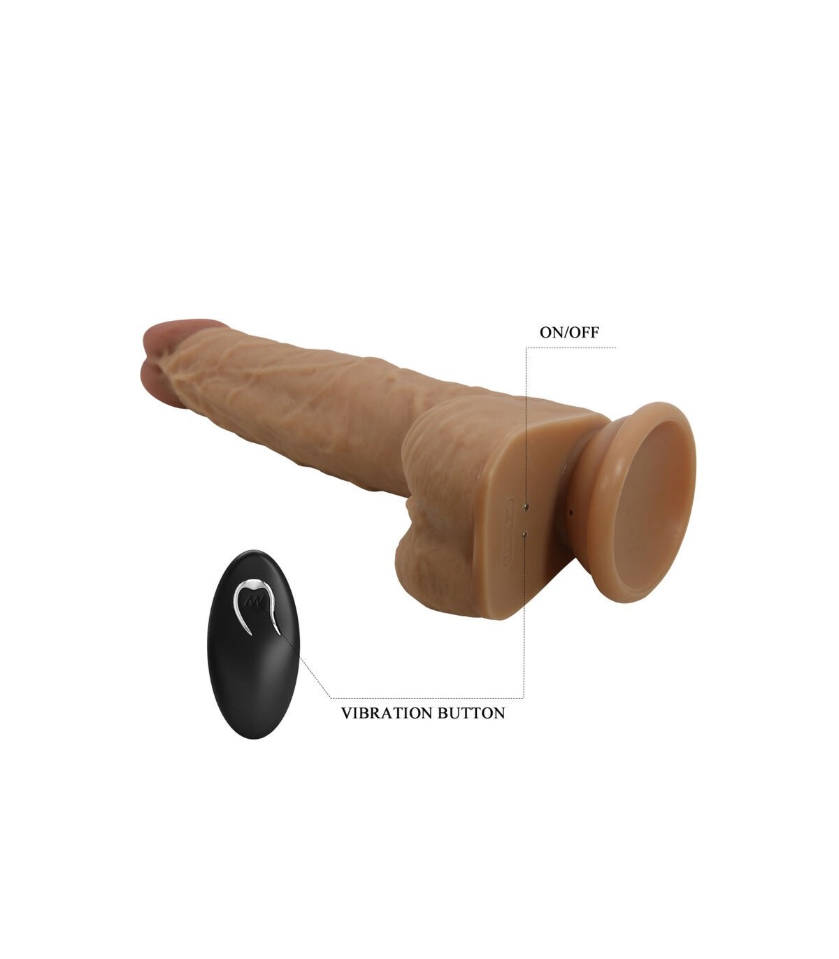 Un vibrador de empuje y vibración con forma de pene realista con una fuerte ventosa que se adhiere a cualquier superficie lisa. La ventosa hace posible la diversión con manos libres. Los 3 modos de vibración y empuje se pueden controlar por separado mediante el mando a distancia o por un compañero. El dador de placer, que empuja y vibra, está cubierto de silicona suave que se siente muy bien contra la piel. El vibrador realista es excitantemente firme y duro sin perder flexibilidad gracias a este material. El material de silicona suave y sedoso parece piel real y también se siente tan suave como el terciopelo. Se puede recargar con el puerto de carga magnético en el extremo del juguete